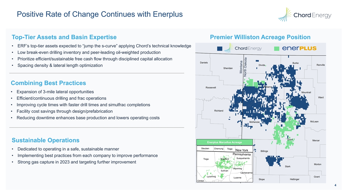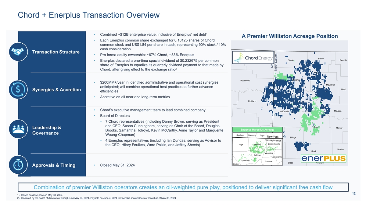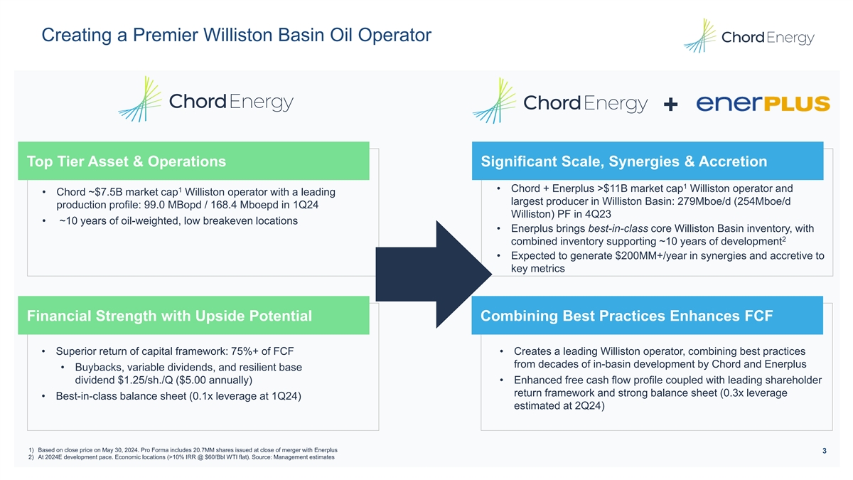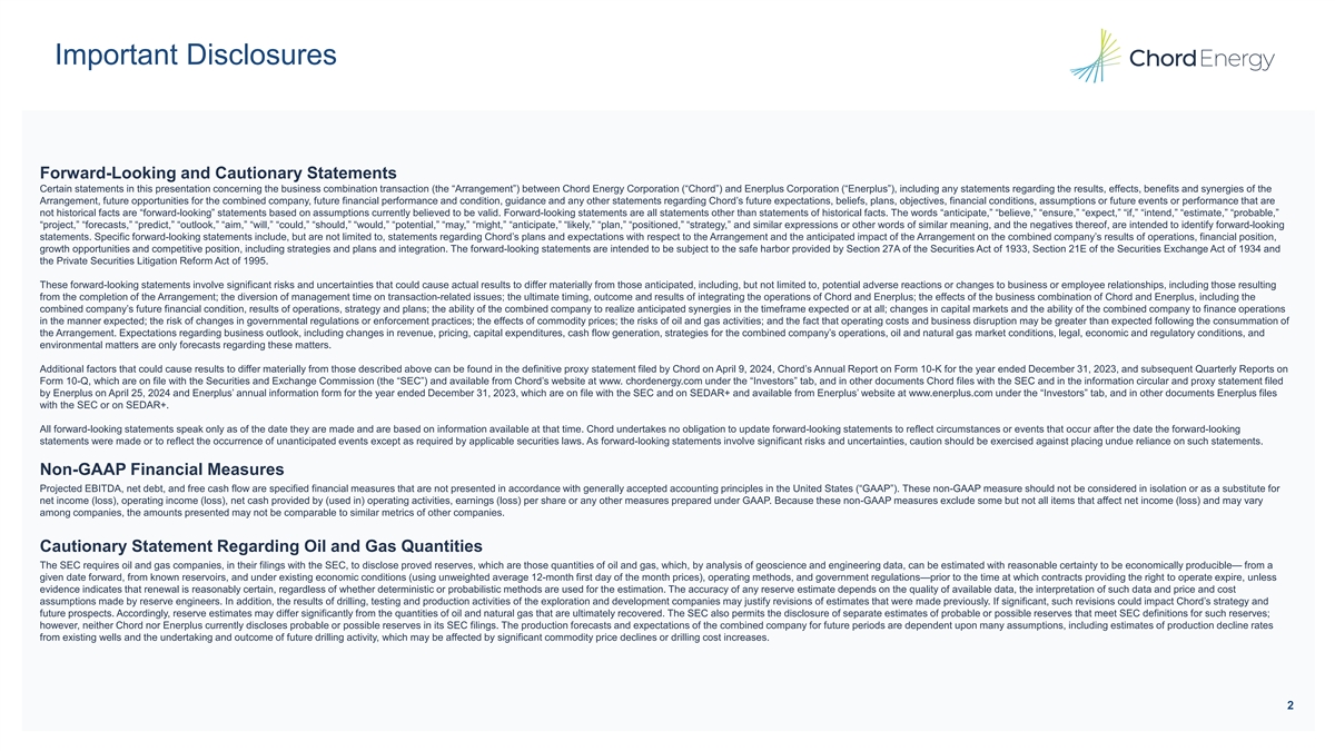 Important Disclosures Forward-Looking and Cautionary Statements Certain statements in this presentation concerning the business combination transaction (the “Arrangement”) between Chord Energy Corporation (“Chord”) and Enerplus Corporation (“Enerplus”), including any statements regarding the results, effects, benefits and synergies of the Arrangement, future opportunities for the combined company, future financial performance and condition, guidance and any other statements regarding Chord’s future expectations, beliefs, plans, objectives, financial conditions, assumptions or future events or performance that are not historical facts are “forward-looking” statements based on assumptions currently believed to be valid. Forward-looking statements are all statements other than statements of historical facts. The words “anticipate,” “believe,” “ensure,” “expect,” “if,” “intend,” “estimate,” “probable,” “project,” “forecasts,” “predict,” “outlook,” “aim,” “will,” “could,” “should,” “would,” “potential,” “may,” “might,” “anticipate,” “likely,” “plan,” “positioned,” “strategy,” and similar expressions or other words of similar meaning, and the negatives thereof, are intended to identify forward-looking statements. Specific forward-looking statements include, but are not limited to, statements regarding Chord’s plans and expectations with respect to the Arrangement and the anticipated impact of the Arrangement on the combined company’s results of operations, financial position, growth opportunities and competitive position, including strategies and plans and integration. The forward-looking statements are intended to be subject to the safe harbor provided by Section 27A of the Securities Act of 1933, Section 21E of the Securities Exchange Act of 1934 and the Private Securities Litigation Reform Act of 1995. These forward-looking statements involve significant risks and uncertainties that could cause actual results to differ materially from those anticipated, including, but not limited to, potential adverse reactions or changes to business or employee relationships, including those resulting from the completion of the Arrangement; the diversion of management time on transaction-related issues; the ultimate timing, outcome and results of integrating the operations of Chord and Enerplus; the effects of the business combination of Chord and Enerplus, including the combined company’s future financial condition, results of operations, strategy and plans; the ability of the combined company to realize anticipated synergies in the timeframe expected or at all; changes in capital markets and the ability of the combined company to finance operations in the manner expected; the risk of changes in governmental regulations or enforcement practices; the effects of commodity prices; the risks of oil and gas activities; and the fact that operating costs and business disruption may be greater than expected following the consummation of the Arrangement. Expectations regarding business outlook, including changes in revenue, pricing, capital expenditures, cash flow generation, strategies for the combined company’s operations, oil and natural gas market conditions, legal, economic and regulatory conditions, and environmental matters are only forecasts regarding these matters. Additional factors that could cause results to differ materially from those described above can be found in the definitive proxy statement filed by Chord on April 9, 2024, Chord’s Annual Report on Form 10-K for the year ended December 31, 2023, and subsequent Quarterly Reports on Form 10-Q, which are on file with the Securities and Exchange Commission (the “SEC”) and available from Chord’s website at www. chordenergy.com under the “Investors” tab, and in other documents Chord files with the SEC and in the information circular and proxy statement filed by Enerplus on April 25, 2024 and Enerplus’ annual information form for the year ended December 31, 2023, which are on file with the SEC and on SEDAR+ and available from Enerplus’ website at www.enerplus.com under the “Investors” tab, and in other documents Enerplus files with the SEC or on SEDAR+. All forward-looking statements speak only as of the date they are made and are based on information available at that time. Chord undertakes no obligation to update forward-looking statements to reflect circumstances or events that occur after the date the forward-looking statements were made or to reflect the occurrence of unanticipated events except as required by applicable securities laws. As forward-looking statements involve significant risks and uncertainties, caution should be exercised against placing undue reliance on such statements. Non-GAAP Financial Measures Projected EBITDA, net debt, and free cash flow are specified financial measures that are not presented in accordance with generally accepted accounting principles in the United States (“GAAP”). These non-GAAP measure should not be considered in isolation or as a substitute for net income (loss), operating income (loss), net cash provided by (used in) operating activities, earnings (loss) per share or any other measures prepared under GAAP. Because these non-GAAP measures exclude some but not all items that affect net income (loss) and may vary among companies, the amounts presented may not be comparable to similar metrics of other companies. Cautionary Statement Regarding Oil and Gas Quantities The SEC requires oil and gas companies, in their filings with the SEC, to disclose proved reserves, which are those quantities of oil and gas, which, by analysis of geoscience and engineering data, can be estimated with reasonable certainty to be economically producible— from a given date forward, from known reservoirs, and under existing economic conditions (using unweighted average 12-month fir