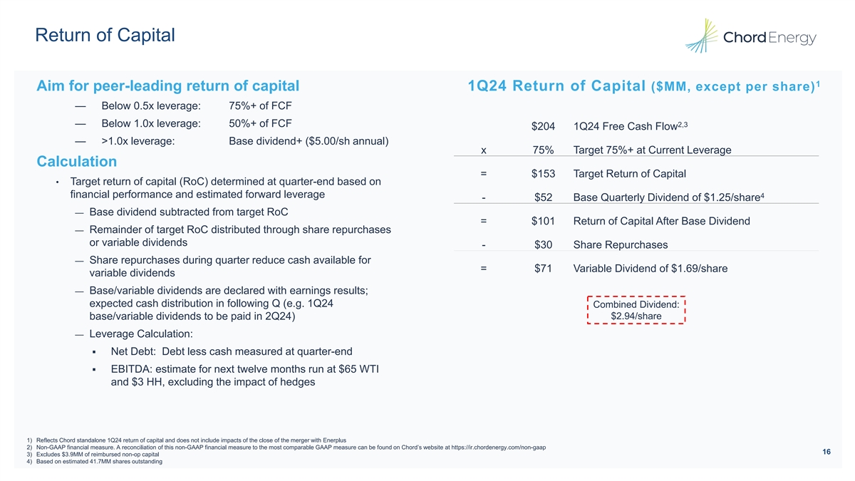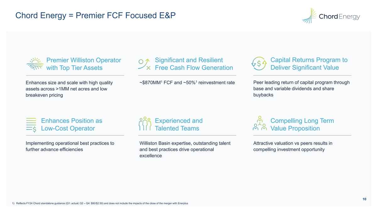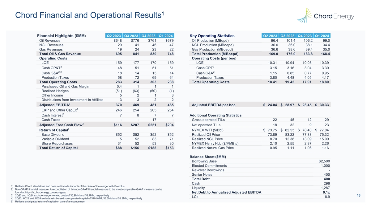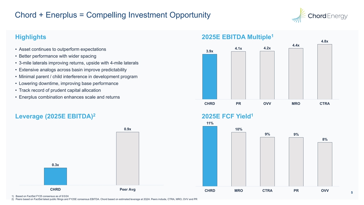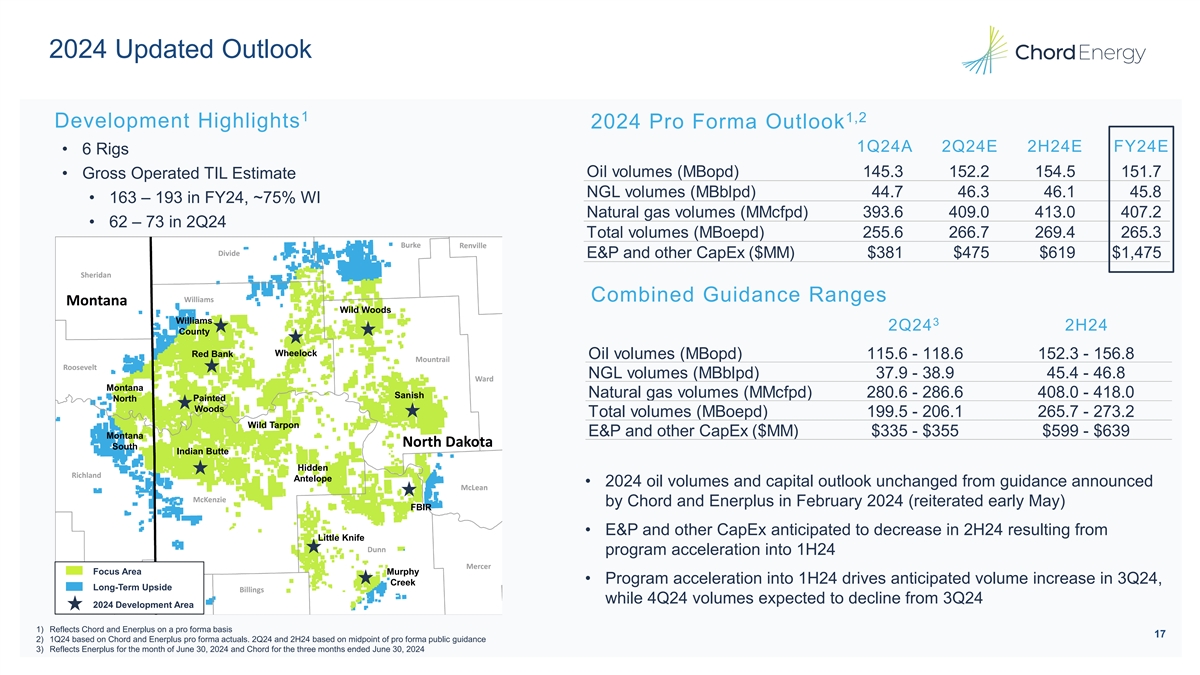 Important Disclosures Forward-Looking and Cautionary Statements Certain statements in this presentation concerning the business combination transaction (the “Arrangement”) between Chord Energy Corporation (“Chord”) and Enerplus Corporation (“Enerplus”), including any statements regarding the results, effects, benefits and synergies of the Arrangement, future opportunities for the combined company, future financial performance and condition, guidance and any other statements regarding Chord’s future expectations, beliefs, plans, objectives, financial conditions, assumptions or future events or performance that are not historical facts are “forward-looking” statements based on assumptions currently believed to be valid. Forward-looking statements are all statements other than statements of historical facts. The words “anticipate,” “believe,” “ensure,” “expect,” “if,” “intend,” “estimate,” “probable,” “project,” “forecasts,” “predict,” “outlook,” “aim,” “will,” “could,” “should,” “would,” “potential,” “may,” “might,” “anticipate,” “likely,” “plan,” “positioned,” “strategy,” and similar expressions or other words of similar meaning, and the negatives thereof, are intended to identify forward-looking statements. Specific forward-looking statements include, but are not limited to, statements regarding Chord’s plans and expectations with respect to the Arrangement and the anticipated impact of the Arrangement on the combined company’s results of operations, financial position, growth opportunities and competitive position, including strategies and plans and integration. The forward-looking statements are intended to be subject to the safe harbor provided by Section 27A of the Securities Act of 1933, Section 21E of the Securities Exchange Act of 1934 and the Private Securities Litigation Reform Act of 1995. These forward-looking statements involve significant risks and uncertainties that could cause actual results to differ materially from those anticipated, including, but not limited to, potential adverse reactions or changes to business or employee relationships, including those resulting from the completion of the Arrangement; the diversion of management time on transaction-related issues; the ultimate timing, outcome and results of integrating the operations of Chord and Enerplus; the effects of the business combination of Chord and Enerplus, including the combined company’s future financial condition, results of operations, strategy and plans; the ability of the combined company to realize anticipated synergies in the timeframe expected or at all; changes in capital markets and the ability of the combined company to finance operations in the manner expected; the risk of changes in governmental regulations or enforcement practices; the effects of commodity prices; the risks of oil and gas activities; and the fact that operating costs and business disruption may be greater than expected following the consummation of the Arrangement. Expectations regarding business outlook, including changes in revenue, pricing, capital expenditures, cash flow generation, strategies for the combined company’s operations, oil and natural gas market conditions, legal, economic and regulatory conditions, and environmental matters are only forecasts regarding these matters. Additional factors that could cause results to differ materially from those described above can be found in the definitive proxy statement filed by Chord on April 9, 2024, Chord’s Annual Report on Form 10-K for the year ended December 31, 2023, and subsequent Quarterly Reports on Form 10-Q, which are on file with the Securities and Exchange Commission (the “SEC”) and available from Chord’s website at www. chordenergy.com under the “Investors” tab, and in other documents Chord files with the SEC and in the information circular and proxy statement filed by Enerplus on April 25, 2024 and Enerplus’ annual information form for the year ended December 31, 2023, which are on file with the SEC and on SEDAR+ and available from Enerplus’ website at www.enerplus.com under the “Investors” tab, and in other documents Enerplus files with the SEC or on SEDAR+. All forward-looking statements speak only as of the date they are made and are based on information available at that time. Chord undertakes no obligation to update forward-looking statements to reflect circumstances or events that occur after the date the forward-looking statements were made or to reflect the occurrence of unanticipated events except as required by applicable securities laws. As forward-looking statements involve significant risks and uncertainties, caution should be exercised against placing undue reliance on such statements. Non-GAAP Financial Measures Projected EBITDA, net debt, and free cash flow are specified financial measures that are not presented in accordance with generally accepted accounting principles in the United States (“GAAP”). These non-GAAP measure should not be considered in isolation or as a substitute for net income (loss), operating income (loss), net cash provided by (used in) operating activities, earnings (loss) per share or any other measures prepared under GAAP. Because these non-GAAP measures exclude some but not all items that affect net income (loss) and may vary among companies, the amounts presented may not be comparable to similar metrics of other companies. Cautionary Statement Regarding Oil and Gas Quantities The SEC requires oil and gas companies, in their filings with the SEC, to disclose proved reserves, which are those quantities of oil and gas, which, by analysis of geoscience and engineering data, can be estimated with reasonable certainty to be economically producible— from a given date forward, from known reservoirs, and under existing economic conditions (using unweighted average 12-month fir