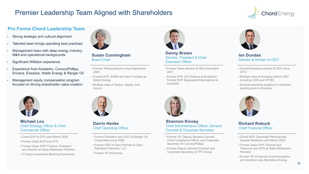 Chord + Enerplus Transaction Overview 1 • Combined ~$12B enterprise value, inclusive of Enerplus’ net debt A Premier Williston Acreage Position • Each Enerplus common share exchanged for 0.10125 shares of Chord common stock and US$1.84 per share in cash, representing 90% stock / 10% cash consideration Transaction Structure • Pro forma equity ownership: ~67% Chord, ~33% Enerplus • Enerplus declared a one-time special dividend of $0.232675 per common share of Enerplus to equalize its quarterly dividend payment to that made by 2 Chord, after giving effect to the exchange ratio • $200MM+/year in identified administrative and operational cost synergies anticipated; will combine operational best practices to further advance Synergies & Accretion efficiencies • Accretive on all near and long-term metrics • Chord’s executive management team to lead combined company • Board of Directors • 7 Chord representatives (including Danny Brown, serving as President and CEO, Susan Cunningham, serving as Chair of the Board, Douglas Leadership & Enerplus Marcellus Acreage Brooks, Samantha Holroyd, Kevin McCarthy, Anne Taylor and Marguerite Governance Woung-Chapman) • 4 Enerplus representatives (including Ian Dundas, serving as Advisor to the CEO, Hilary Foulkes, Ward Polzin, and Jeffrey Sheets) • Closed May 31, 2024 Approvals & Timing Combination of premier Williston operators creates an oil-weighted pure play, positioned to deliver significant free cash flow 12 1) Based on close price on May 30, 2024 2) Declared by the board of directors of Enerplus on May 23, 2024. Payable on June 4, 2024 to Enerplus shareholders of record as of May 30, 2024