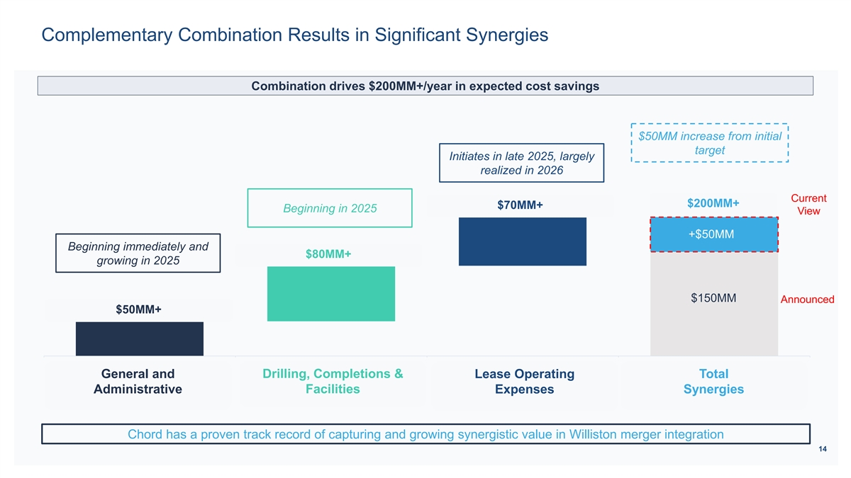 Premier Leadership Team Aligned with Shareholders Pro Forma Chord Leadership Team • Strong strategic and cultural alignment • Talented team brings operating best practices • Management team with deep energy industry, Danny Brown M&A and operational backgrounds Susan Cunningham Ian Dundas Director, President & Chief Board Chair Director & Advisor to CEO Executive Officer • Significant Williston experience • Former Whiting director since September • Former Oasis director & CEO since April • Current Enerplus director & CEO since • Experience from Anadarko, ConocoPhillips, 2020 2021 2013 Encana, Enerplus, Noble Energy & Ranger Oil • Former EVP, EHSR and New Frontiers at • Former EVP, US Onshore at Anadarko; • Multiple roles at Enerplus before CEO Noble Energy Former EVP, Deepwater/International at including COO and VP BD • Management equity compensation program Anadarko focused on driving shareholder value creation • Multiple roles at Texaco, Statoil, and • Several executive positions in merchant Amoco banking prior to Enerplus Michael Lou Shannon Kinney Darrin Henke Richard Robuck Chief Strategy Officer & Chief Chief Administrative Officer, General Chief Operating Officer Chief Financial Officer Commercial Officer Counsel & Corporate Secretary • Chord EVP & CFO until March 2024 • Former President and CEO of Ranger Oil • Former VP, Deputy General Counsel, • Chord SVP, Corporate Planning and Corporation since 2020 Chief Compliance Officer and Corporate Investor Relations until March 2024 • Former Oasis EVP and CFO Secretary for ConocoPhillips • Former CEO of Gary Permian & Gary • Former Oasis SVP, Finance and • Former Oasis SVP, Finance, President Petroleum Partners, LLC • Former Deputy General Counsel and Treasurer and CFO at Oasis Midstream and Director at Oasis Midstream Partners Corporate Secretary at TPC Group Partners • Former VP at Encana • 10 Years Investment Banking Experience • Former VP at Grande Communications and Southern Ute Alternative Energy 13