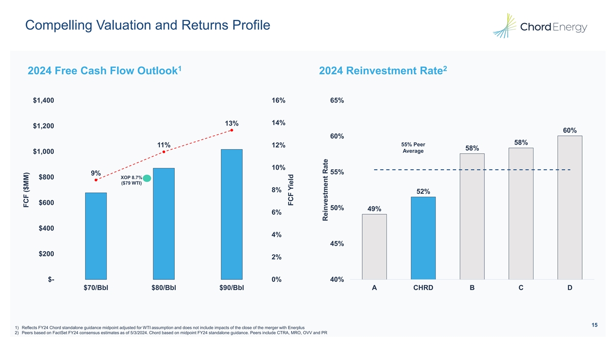 Complementary Combination Results in Significant Synergies Combination drives $200MM+/year in expected cost savings $50MM increase from initial target Initiates in late 2025, largely realized in 2026 Current $200MM+ $70MM+ Beginning in 2025 View +$50MM Beginning immediately and $80MM+ growing in 2025 $150MM Announced $50MM+ General and Drilling, Completions & Lease Operating Total Facilities Administrative Expenses Synergies Chord has a proven track record of capturing and growing synergistic value in Williston merger integration 14