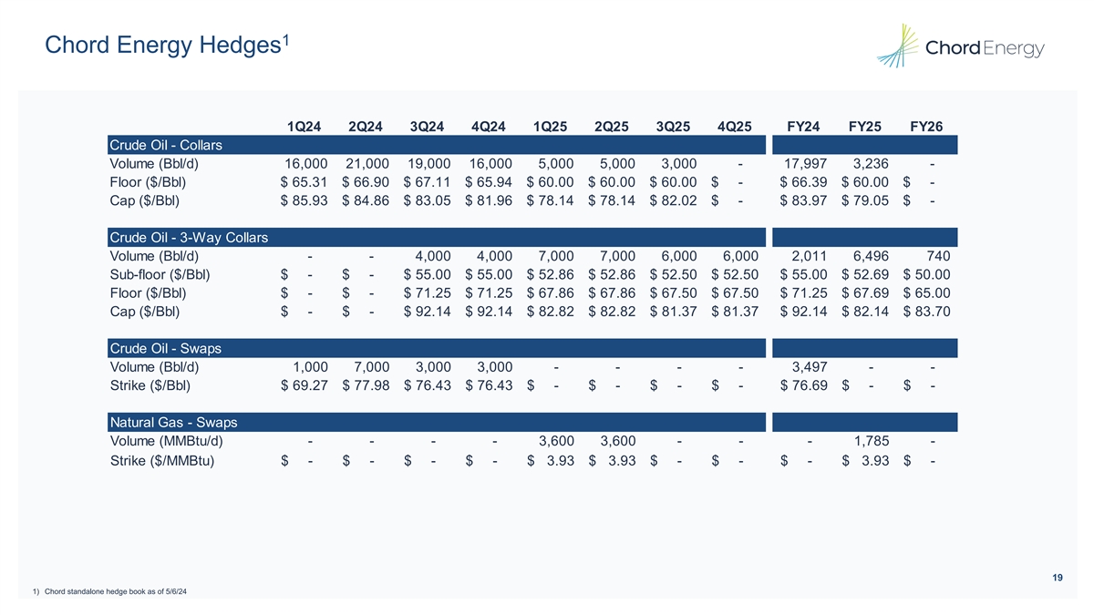 1 Chord Financial and Operational Results Financial Highlights ($MM) Q2 2023 Q3 2023 Q4 2023 Q1 2024 Key Operating Statistics Q2 2023 Q3 2023 Q4 2023 Q1 2024 Oil Revenues $648 $776 $761 $679 Oil Production (MBopd) 96.4 101.4 106.2 99.0 NGL Revenues 29 41 46 47 NGL Production (MBoepd) 36.0 36.0 38.1 34.4 Gas Revenues 19 24 23 22 Gas Production (MBoepd) 36.6 38.6 39.4 35.0 Total Oil & Gas Revenue 695 841 830 748 Total Production (MBoepd) 169.0 176.0 183.8 168.4 Operating Costs Operating Costs (per boe) LOE 159 177 170 159 LOE 10.31 10.94 10.05 10.39 2 2 Cash GP&T 48 51 51 51 Cash GPT 3.15 3.16 3.04 3.30 2,3 2 Cash G&A 18 14 13 14 Cash G&A 1.15 0.85 0.77 0.95 Production Taxes 58 72 69 64 Production Taxes 3.80 4.48 4.05 4.17 Total Operating Costs 283 314 303 288 Total Operating Costs 18.41 19.42 17.91 18.80 Purchased Oil and Gas Margin 0.4 1 1 1 Realized Hedges (51) (63) (50) (1) Other Income 5 2 1 3 Distributions from Investment in Affiliate 3 3 2 2 2 Adjusted EBITDA 370 469 481 465 Adjusted EBITDA per boe $ 24.04 $ 28.97 $ 28.45 $ 30.33 4 E&P and Other CapEx 246 254 205 254 2 Cash Interest 7 8 7 7 Additional Operating Statistics Cash Taxes - - 17 - Gross operated TILs 22 45 12 29 2 Adjusted Free Cash Flow $116 $207 $251 $204 Net operated TILs 18 32 9 23 5 Return of Capital NYMEX WTI ($/Bbl) $ 73.75 $ 82.53 $ 78.40 $ 77.04 Base Dividend $52 $52 $52 $52 Realized Oil Price 73.89 83.22 77.88 75.32 Variable Dividend 5 52 83 71 Realized NGL Price 8.70 12.38 13.09 15.09 Share Repurchases 31 52 53 30 NYMEX Henry Hub ($/MMBtu) 2.10 2.55 2.87 2.26 Total Return of Capital $88 $156 $188 $153 Realized Natural Gas Price 0.95 1.11 1.06 1.16 Balance Sheet ($MM) Borrowing Base $2,500 Elected Commitments 1,000 Revolver Borrowings - Senior Notes 400 Total Debt 400 Cash 296 1) Reflects Chord standalone and does not include impacts of the close of the merger with Enerplus Liquidity 1,287 2) Non-GAAP financial measure. A reconciliation of this non-GAAP financial measure to the most comparable GAAP measure can be found at https://ir.chordenergy.com/non-gaap Net Debt to Annualized Adjusted EBITDA 0.1x 3) 2Q23 and 1Q24 exclude merger-related costs of $6.9MM and $8.1MM, respectively 18 LCs 8.9 4) 2Q23, 4Q23 and 1Q24 exclude reimbursed non-operated capital of $10.9MM, $3.5MM and $3.9MM, respectively 5) Reflects anticipated return of capital on date of announcement
