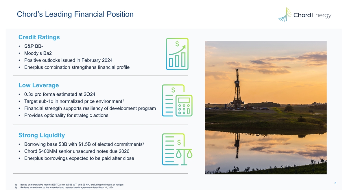 Chord + Enerplus = Compelling Investment Opportunity 1 Highlights 2025E EBITDA Multiple 4.8x 4.4x 4.2x 4.1x • Asset continues to outperform expectations 3.9x • Better performance with wider spacing • 3-mile laterals improving returns, upside with 4-mile laterals • Extensive analogs across basin improve predictability • Minimal parent / child interference in development program • Lowering downtime, improving base performance • Track record of prudent capital allocation • Enerplus combination enhances scale and returns CHRD PR OVV MRO CTRA 2 1 Leverage (2025E EBITDA) 2025E FCF Yield 11% 0.9x 10% 9% 9% 8% 0.3x CHRD Peer Avg CHRD MRO CTRA PR OVV 5 1) Based on FactSet FY25 consensus as of 5/3/24 2) Peers based on FactSet latest public filings and FY25E consensus EBITDA. Chord based on estimated leverage at 2Q24. Peers include, CTRA, MRO, OVV and PR