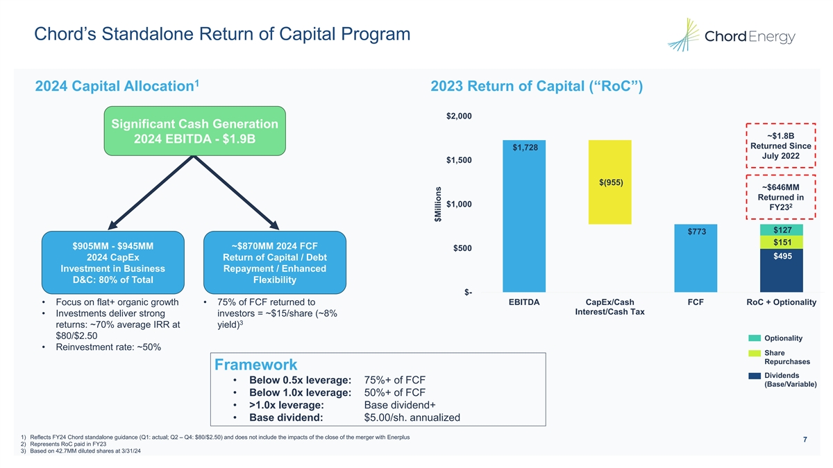 Chord’s Leading Financial Position Credit Ratings • S&P BB- • Moody’s Ba2 • Positive outlooks issued in February 2024 • Enerplus combination strengthens financial profile Low Leverage • 0.3x pro forma estimated at 2Q24 1 • Target sub-1x in normalized price environment • Financial strength supports resiliency of development program • Provides optionality for strategic actions Strong Liquidity 2 • Borrowing base $3B with $1.5B of elected commitments • Chord $400MM senior unsecured notes due 2026 • Enerplus borrowings expected to be paid after close 6 1) Based on next twelve months EBITDA run at $65 WTI and $3 HH, excluding the impact of hedges 2) Reflects amendment to the amended and restated credit agreement dated May 31, 2024