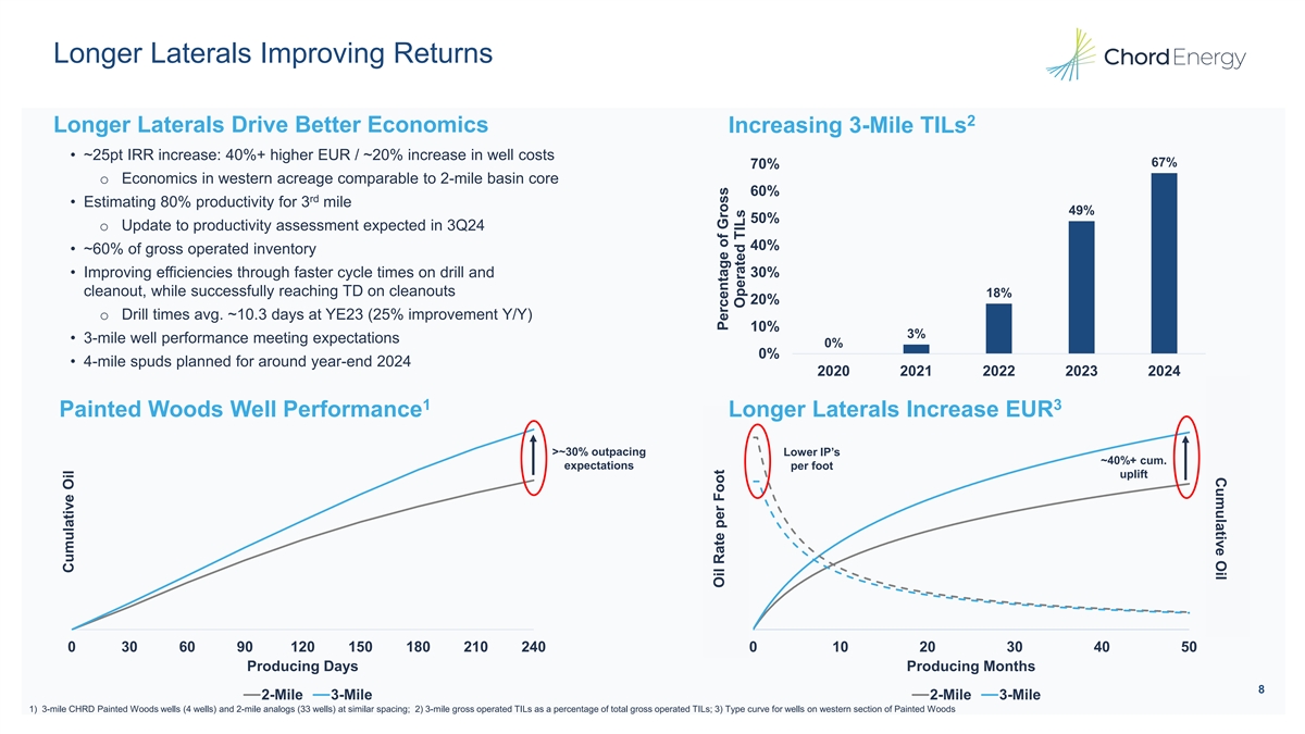 Chord’s Standalone Return of Capital Program 1 2024 Capital Allocation 2023 Return of Capital (“RoC”) $2,000 Significant Cash Generation ~$1.8B 2024 EBITDA - $1.9B Returned Since $1,728 July 2022 $1,500 $(955) ~$646MM Returned in $1,000 2 FY23 $127 $773 $151 $905MM - $945MM ~$870MM 2024 FCF $500 $495 2024 CapEx Return of Capital / Debt Investment in Business Repayment / Enhanced D&C: 80% of Total Flexibility $- EBITDA CapEx/Cash FCF RoC + Optionality • Focus on flat+ organic growth • 75% of FCF returned to Interest/Cash Tax • Investments deliver strong investors = ~$15/share (~8% 3 returns: ~70% average IRR at yield) $80/$2.50 Optionality • Reinvestment rate: ~50% Share Repurchases Framework Dividends • Below 0.5x leverage: 75%+ of FCF (Base/Variable) • Below 1.0x leverage: 50%+ of FCF • >1.0x leverage: Base dividend+ • Base dividend: $5.00/sh. annualized 1) Reflects FY24 Chord standalone guidance (Q1: actual; Q2 – Q4: $80/$2.50) and does not include the impacts of the close of the merger with Enerplus 7 2) Represents RoC paid in FY23 3) Based on 42.7MM diluted shares at 3/31/24 $Millions