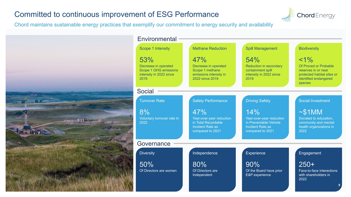 Committed to continuous improvement of ESG Performance Chord maintains sustainable energy practices that exemplify our commitment to energy security and availability Environmental Scope 1 Intensity Methane Reduction Spill Management Biodiversity 53% 47% 54% <1% Decrease in operated Decrease in operated Reduction in secondary Of Proved or Probable Scope 1 GHG emissions Scope 1 methane containment spill reserves in or near intensity in 2022 since emissions intensity in intensity in 2022 since protected habitat sites or 2019 2022 since 2019 2019 identified endangered species Social Turnover Rate Safety Performance Driving Safety Social Investment 8% 47% 14% ~$1MM Voluntary turnover rate in Year-over-year reduction Year-over-year reduction Donated to education, 2022 in Total Recordable in Preventable Vehicle community and mental Incident Rate as Incident Rate as health organizations in compared to 2021 compared to 2021 2022 Governance Diversity Independence Experience Engagement 50% 80% 90% 250+ Of Directors are women Of Directors are Of the Board have prior Face-to-face interactions Independent E&P experience with shareholders in 2022 9