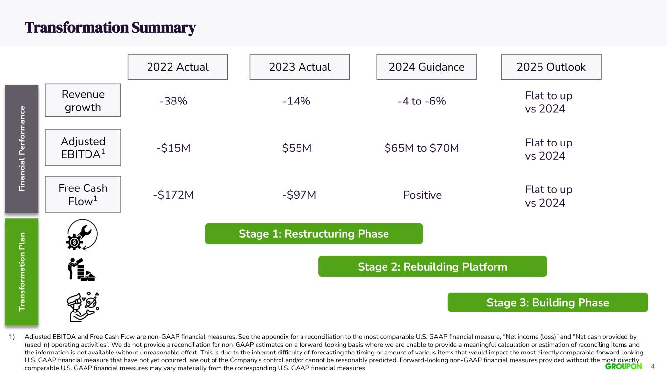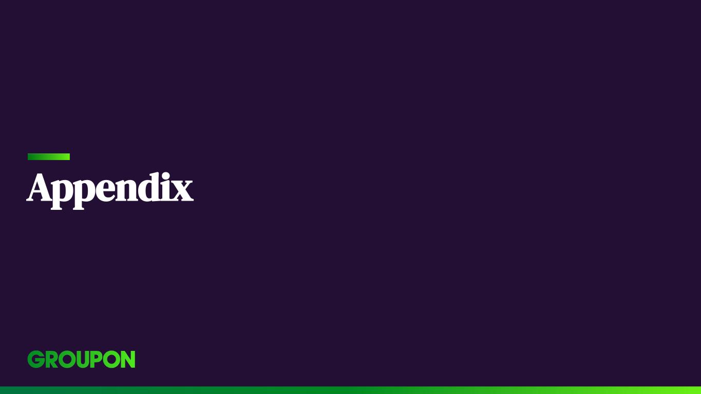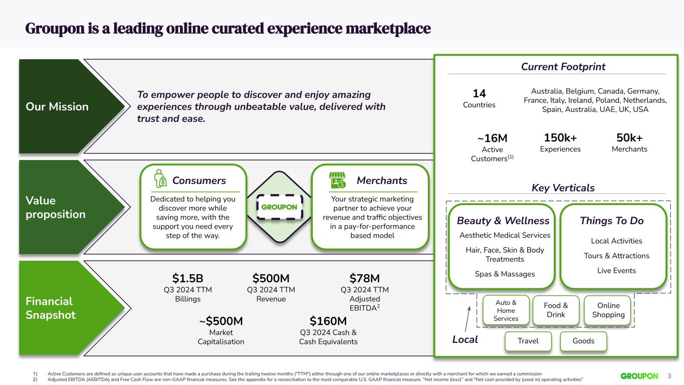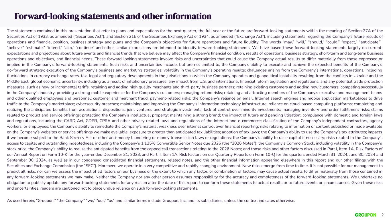 2 Forward-looking statements and other information 2 The statements contained in this presentation that refer to plans and expectations for the next quarter, the full year or the future are forward-looking statements within the meaning of Section 27A of the Securities Act of 1933, as amended (“Securities Act”), and Section 21E of the Securities Exchange Act of 1934, as amended (“Exchange Act”), including statements regarding the Company’s future results of operations and financial position, business strategy and plans and the Company’s objectives for future operations and future liquidity. The words “may,” “will,” “should,” “could,” “expect,” “anticipate,” “believe,” “estimate,” “intend,” “aim,” “continue” and other similar expressions are intended to identify forward-looking statements. We have based these forward-looking statements largely on current expectations and projections about future events and financial trends that we believe may affect the Company’s financial condition, results of operations, business strategy, short-term and long-term business operations and objectives, and financial needs. These forward-looking statements involve risks and uncertainties that could cause the Company actual results to differ materially from those expressed or implied in the Company’s forward-looking statements. Such risks and uncertainties include, but are not limited to, the Company’s ability to execute and achieve the expected benefits of the Company’s go-forward strategy; execution of the Company’s business and marketing strategies; volatility in the Company’s operating results; challenges arising from the Company’s international operations, including fluctuations in currency exchange rates, tax, legal and regulatory developments in the jurisdictions in which the Company operates and geopolitical instability resulting from the conflicts in Ukraine and the Middle East; global economic uncertainty, including as a result of inflationary pressures; any impact from U.S. and international financial reform legislation and regulations, and any potential trade protection measures, such as new or incremental tariffs; retaining and adding high quality merchants and third-party business partners; retaining existing customers and adding new customers; competing successfully in the Company’s industry; providing a strong mobile experience for the Company’s customers; managing refund risks; retaining and attracting members of the Company’s executive and management teams and other qualified employees and personnel; customer and merchant fraud; payment-related risks; the Company’s reliance on email, Internet search engines and mobile application marketplaces to drive traffic to the Company’s marketplace; cybersecurity breaches; maintaining and improving the Company’s information technology infrastructure; reliance on cloud-based computing platforms; completing and realizing the anticipated benefits from acquisitions, dispositions, joint ventures and strategic investments; lack of control over minority investments; managing inventory and order fulfillment risks; claims related to product and service offerings; protecting the Company’s intellectual property; maintaining a strong brand; the impact of future and pending litigation; compliance with domestic and foreign laws and regulations, including the CARD Act, GDPR, CPRA and other privacy-related laws and regulations of the Internet and e-commerce; classification of the Company’s independent contractors, agency workers, or employees; the Company’s ability to remediate the Company’s material weakness over internal control over financial reporting; risks relating to information or content published or made available on the Company’s websites or service offerings we make available; exposure to greater than anticipated tax liabilities; adoption of tax laws; the Company’s ability to use the Company’s tax attributes; impacts if we become subject to the Bank Secrecy Act or other anti-money laundering or money transmission laws or regulations; the Company’s ability to raise capital if necessary; risks related to the Company’s access to capital and outstanding indebtedness, including the Company’s 1.125% Convertible Senior Notes due 2026 (the “2026 Notes”); the Company’s Common Stock, including volatility in the Company’s stock price; the Company’s ability to realize the anticipated benefits from the capped call transactions relating to the 2026 Notes; and those risks and other factors discussed in Part I, Item 1A. Risk Factors of our Annual Report on Form 10-K for the year-ended December 31, 2023, and Part II, Item 1A. Risk Factors on our Quarterly Reports on Form 10-Q for the quarters ended March 31, 2024, June 30, 2024 and September 30, 2024, as well as in our condensed consolidated financial statements, related notes, and the other financial information appearing elsewhere in this report and our other filings with the Securities and Exchange Commission (the “SEC”). Moreover, we operate in a very competitive and rapidly changing environment. New risks emerge from time to time. It is not possible for our management to predict all risks, nor can we assess the impact of all factors on our business or the extent to which any factor, or combination of factors, may cause actual results to differ materially from those contained in any forward-looking statements we may make. Neither the Company nor any other person assumes responsibility for the accuracy and completeness of the forward-looking statements. We undertake no obligation to publicly update any forward-looking statements for any reason after the date of this report to conform these statements to actual results or to future events or circumstances. Given these risks and uncertainties, readers are cautioned not to place undue reliance on such forward-looking statements. As used herein, “Groupon,”