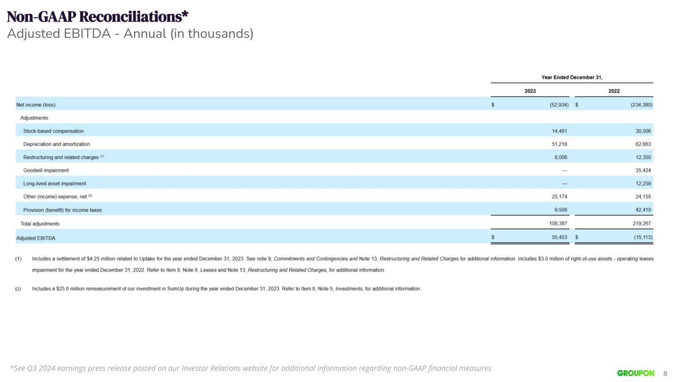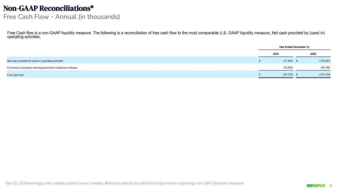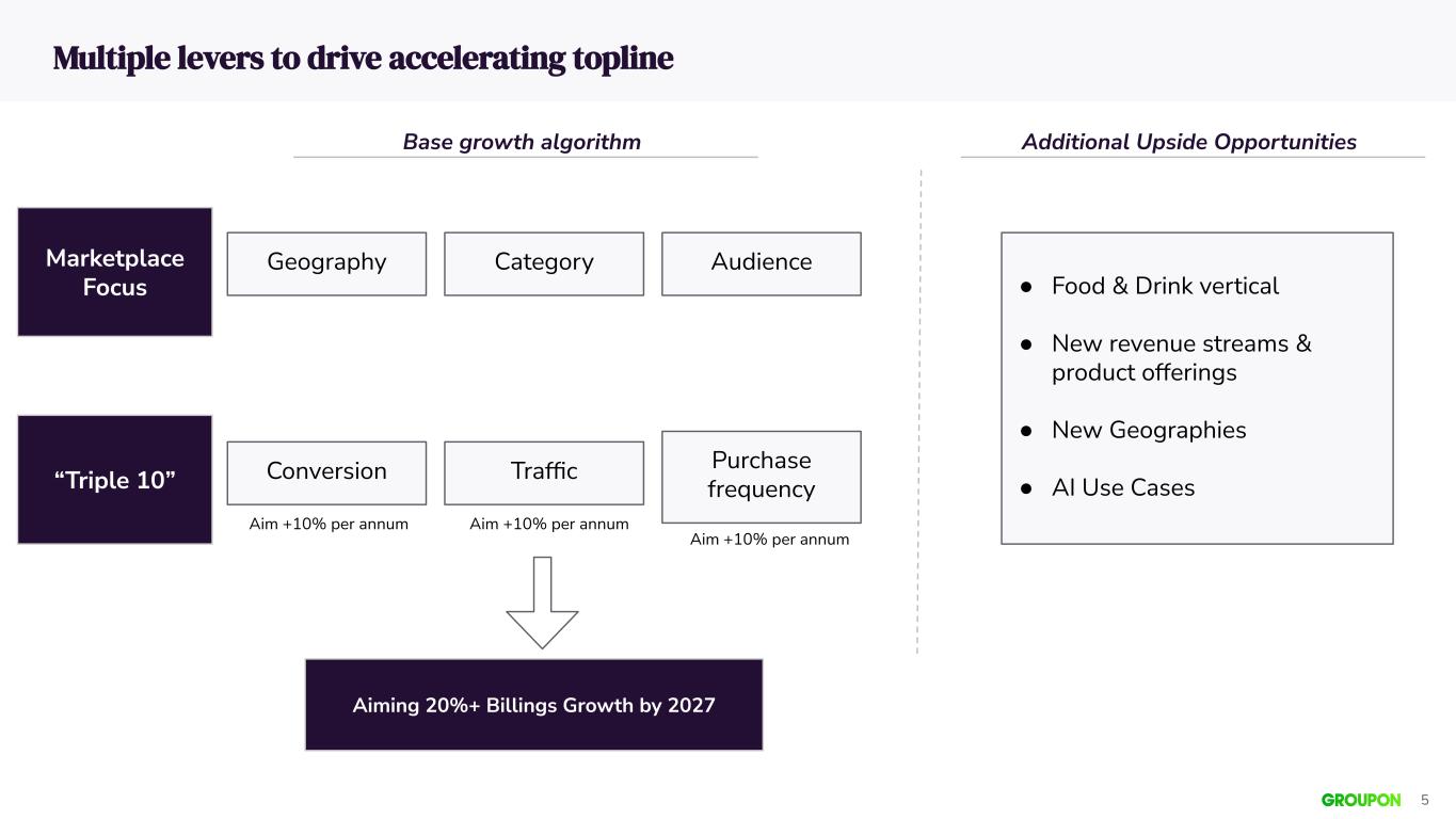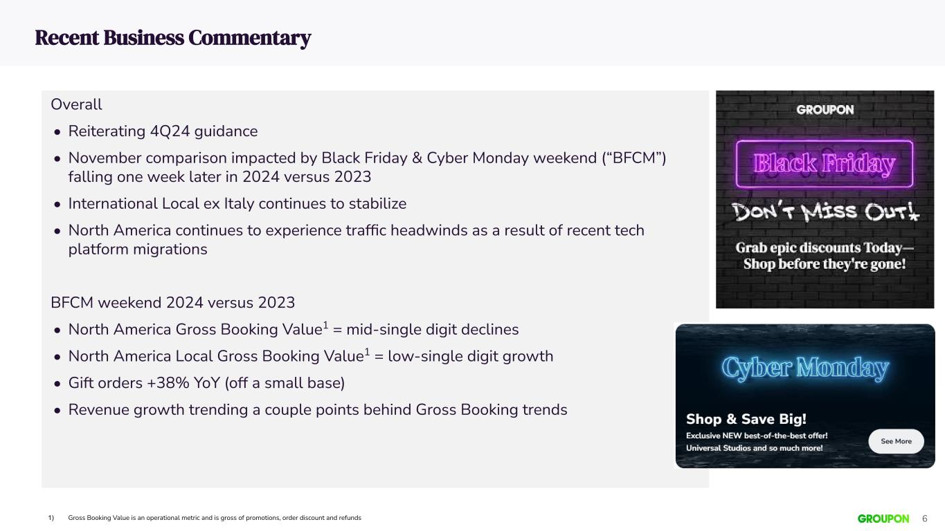 2 Forward-looking statements and other information 2 The statements contained in this presentation that refer to plans and expectations for the next quarter, the full year or the future are forward-looking statements within the meaning of Section 27A of the Securities Act of 1933, as amended (“Securities Act”), and Section 21E of the Securities Exchange Act of 1934, as amended (“Exchange Act”), including statements regarding the Company’s future results of operations and financial position, business strategy and plans and the Company’s objectives for future operations and future liquidity. The words “may,” “will,” “should,” “could,” “expect,” “anticipate,” “believe,” “estimate,” “intend,” “aim,” “continue” and other similar expressions are intended to identify forward-looking statements. We have based these forward-looking statements largely on current expectations and projections about future events and financial trends that we believe may affect the Company’s financial condition, results of operations, business strategy, short-term and long-term business operations and objectives, and financial needs. These forward-looking statements involve risks and uncertainties that could cause the Company actual results to differ materially from those expressed or implied in the Company’s forward-looking statements. Such risks and uncertainties include, but are not limited to, the Company’s ability to execute and achieve the expected benefits of the Company’s go-forward strategy; execution of the Company’s business and marketing strategies; volatility in the Company’s operating results; challenges arising from the Company’s international operations, including fluctuations in currency exchange rates, tax, legal and regulatory developments in the jurisdictions in which the Company operates and geopolitical instability resulting from the conflicts in Ukraine and the Middle East; global economic uncertainty, including as a result of inflationary pressures; any impact from U.S. and international financial reform legislation and regulations, and any potential trade protection measures, such as new or incremental tariffs; retaining and adding high quality merchants and third-party business partners; retaining existing customers and adding new customers; competing successfully in the Company’s industry; providing a strong mobile experience for the Company’s customers; managing refund risks; retaining and attracting members of the Company’s executive and management teams and other qualified employees and personnel; customer and merchant fraud; payment-related risks; the Company’s reliance on email, Internet search engines and mobile application marketplaces to drive traffic to the Company’s marketplace; cybersecurity breaches; maintaining and improving the Company’s information technology infrastructure; reliance on cloud-based computing platforms; completing and realizing the anticipated benefits from acquisitions, dispositions, joint ventures and strategic investments; lack of control over minority investments; managing inventory and order fulfillment risks; claims related to product and service offerings; protecting the Company’s intellectual property; maintaining a strong brand; the impact of future and pending litigation; compliance with domestic and foreign laws and regulations, including the CARD Act, GDPR, CPRA and other privacy-related laws and regulations of the Internet and e-commerce; classification of the Company’s independent contractors, agency workers, or employees; the Company’s ability to remediate the Company’s material weakness over internal control over financial reporting; risks relating to information or content published or made available on the Company’s websites or service offerings we make available; exposure to greater than anticipated tax liabilities; adoption of tax laws; the Company’s ability to use the Company’s tax attributes; impacts if we become subject to the Bank Secrecy Act or other anti-money laundering or money transmission laws or regulations; the Company’s ability to raise capital if necessary; risks related to the Company’s access to capital and outstanding indebtedness, including the Company’s 1.125% Convertible Senior Notes due 2026 (the “2026 Notes”); the Company’s Common Stock, including volatility in the Company’s stock price; the Company’s ability to realize the anticipated benefits from the capped call transactions relating to the 2026 Notes; and those risks and other factors discussed in Part I, Item 1A. Risk Factors of our Annual Report on Form 10-K for the year-ended December 31, 2023, and Part II, Item 1A. Risk Factors on our Quarterly Reports on Form 10-Q for the quarters ended March 31, 2024, June 30, 2024 and September 30, 2024, as well as in our condensed consolidated financial statements, related notes, and the other financial information appearing elsewhere in this report and our other filings with the Securities and Exchange Commission (the “SEC”). Moreover, we operate in a very competitive and rapidly changing environment. New risks emerge from time to time. It is not possible for our management to predict all risks, nor can we assess the impact of all factors on our business or the extent to which any factor, or combination of factors, may cause actual results to differ materially from those contained in any forward-looking statements we may make. Neither the Company nor any other person assumes responsibility for the accuracy and completeness of the forward-looking statements. We undertake no obligation to publicly update any forward-looking statements for any reason after the date of this report to conform these statements to actual results or to future events or circumstances. Given these risks and uncertainties, readers are cautioned not to place undue reliance on such forward-looking statements. As used herein, “Groupon,”
