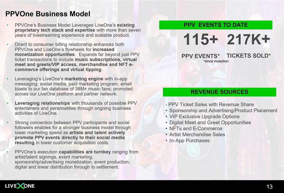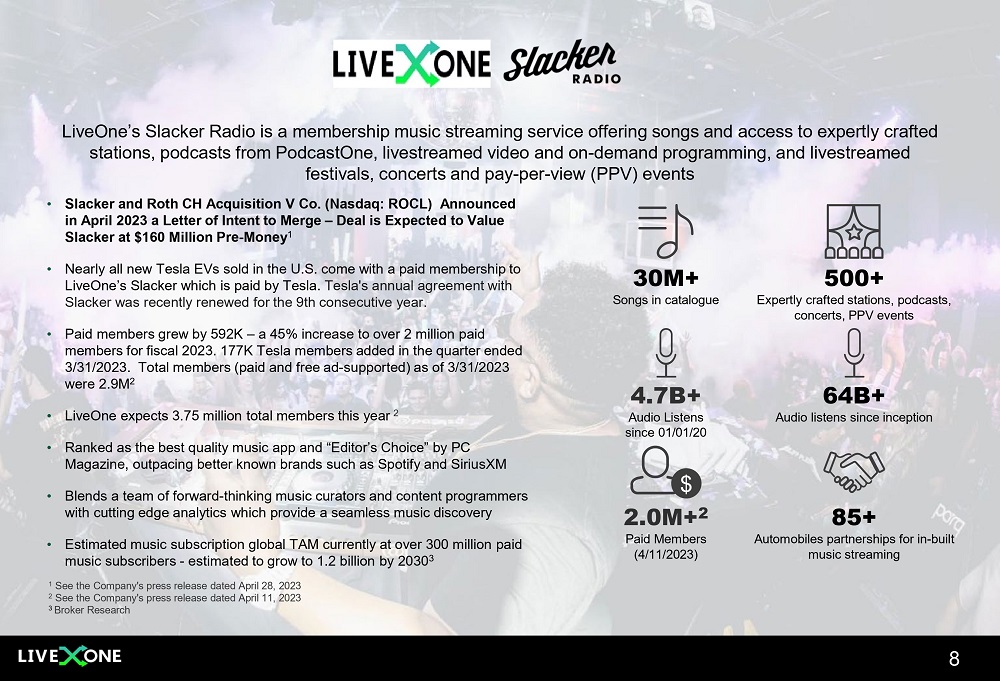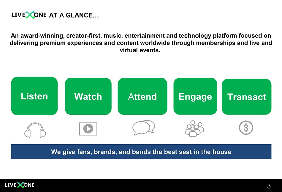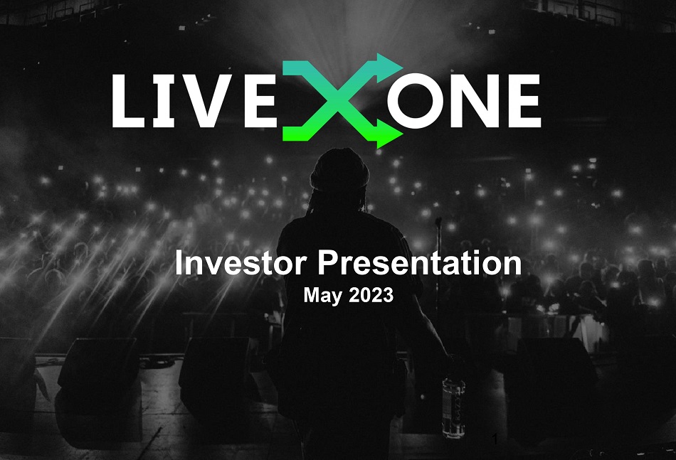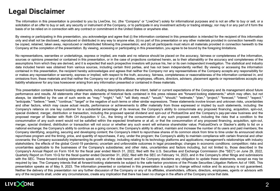 The information in this presentation is provided to you by LiveOne, Inc . (the “Company” or “LiveOne”) solely for informational purposes and is not an offer to buy or sell, or a solicitation of an offer to buy or sell, any security or instrument of the Company, or to participate in any investment activity or trading strategy, nor may it or any part of it form the basis of or be relied on in connection with any contract or commitment in the United States or anywhere else . By viewing or participating in this presentation, you acknowledge and agree that (i) the information contained in this presentation is intended for the recipient of this information only and shall not be disclosed, reproduced or distributed in any way to anyone else, (ii) no part of this presentation or any other materials provided in connection herewith may be copied, retained, taken away, reproduced or redistributed following this presentation, and (iii) all participants must return all materials provided in connection herewith to the Company at the completion of the presentation . By viewing, accessing or participating in this presentation, you agree to be bound by the foregoing limitations . No representations, warranties or undertakings, express or implied, are made and no reliance should be placed on the accuracy, fairness or completeness of the information, sources or opinions presented or contained in this presentation, or in the case of projections contained herein, as to their attainability or the accuracy and completeness of the assumptions from which they are derived, and it is expected that each prospective investors will pursue his, her or its own independent investigation . The statistical and industry data included herein was obtained from various sources, including certain third parties, and has not been independently verified . By viewing or accessing the information contained in this presentation, the recipient hereby acknowledges and agrees that neither the Company nor any representatives of the Company accepts any responsibility for or makes any representation or warranty, express or implied, with respect to the truth, accuracy, fairness, completeness or reasonableness of the information contained in, and omissions from, these materials and that neither the Company nor any of its affiliates, employees, officers, directors, advisers, placement agents or representatives accepts any liability whatsoever for any loss howsoever arising from any information presented or contained in these materials . This presentation contains forward - looking statements, including descriptions about the intent, belief or current expectations of the Company and its management about future performance and results . All statements other than statements of historical facts contained in this press release are "forward - looking statements," which may often, but not always, be identified by the use of such words as "may," "might," "will," "will likely result," "would," "should," "estimate," "plan," "project," "forecast," "intend," "expect," "anticipate," "believe," "seek," "continue," "target" or the negative of such terms or other similar expressions . These statements involve known and unknown risks, uncertainties and other factors, which may cause actual results, performance or achievements to differ materially from those expressed or implied by such statements, including : the Company's reliance on one key customer for a substantial percentage of its revenue ; the Company's ability to consummate any proposed financing, acquisition, spin - out, special dividend, merger, distribution or transaction, including the proposed special dividend and spin - out of PodcastOne and the Company’s pay - per - view business and the proposed merger of Slacker with Roth CH Acquisition V Co . , the timing of the consummation of any such proposed event, including the risks that a condition to the consummation of any such event would not be satisfied within the expected timeframe or at all, or that the consummation of any proposed financing, acquisition, spin - out, merger, special dividend, distribution or transaction will not occur or whether any such event will enhance shareholder value ; PodcastOne's or Slacker’s ability to list on a national exchange ; the Company's ability to continue as a going concern ; the Company's ability to attract, maintain and increase the number of its users and paid members ; the Company identifying, acquiring, securing and developing content ; the Company's intent to repurchase shares of its common stock from time to time under its announced stock repurchase program and the timing, price, and quantity of repurchases, if any, under the program ; the Company's ability to maintain compliance with certain financial and other covenants ; the Company successfully implementing its growth strategy, including relating to its technology platforms and applications ; management's relationships with industry stakeholders ; the effects of the global Covid - 19 pandemic ; uncertain and unfavorable outcomes in legal proceedings ; changes in economic conditions ; competition ; risks and uncertainties applicable to the businesses of the Company's subsidiaries ; and other risks, uncertainties and factors including, but not limited to, those described in the Company's Annual Report on Form 10 - K for the fiscal year ended March 31 , 2022 , filed with the U . S . Securities and Exchange Commission (the "SEC") on June 29 , 2022 , Quarterly Report on Form 10 - Q for the fiscal quarter ended December 31 , 2022 , filed with the SEC on February 14 , 2023 , and in the Company's other filings and submissions with the SEC . These forward - looking statements speak only as of the date hereof, and the Company disclaims any obligation to update these statements, except as may be required by law . The Company intends that all forward - looking statements be subject to the safe - harbor provisions of the Private Securities Litigat