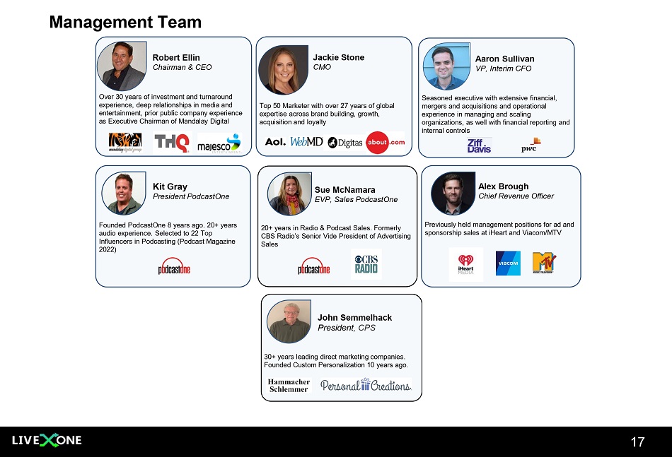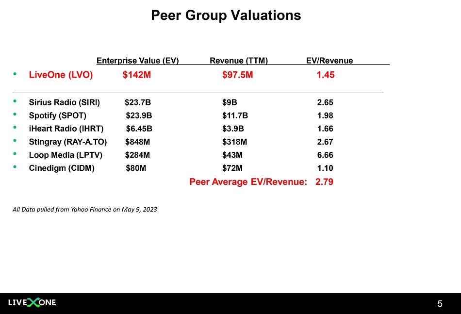 Financial Highlights • Company guidance for consolidated full - year Fiscal 2023 ending 3/31/2023: Revenue $100M - $110M; Adjusted EBITDA** $11M - $12M • Company guidance for consolidated full - year Fiscal 2024 ending 3/31/2024: Revenue $115M - $125M; Adjusted EBITDA** $12M - $15M • FY 2023 guidance for LiveOne’s audio division (Slacker Radio and PodcastOne): Revenue ~$88M; Adjusted EBITDA** ~$18M, an increase of 18% in revenue and 100%+ in Adjusted EBITDA** compared to FY 2022. • FY 2024 guidance for audio division: Revenue 95M - $105M; Adjusted EBITDA** ~$12M • Cash and Cash Equivalents on hand at April 20, 2023 was $9 million and short - term assets of $28 million. • LiveOne has repurchased ~2.6 million shares of common stock under its Share Stock Repurchase Program as of 4/27/2023 leaving capacity to repurchase an additional $2.72M worth of shares of common stock. • Recently converted $21M of existing debt into LiveOne’s preferred stock convertible into shares of LiveOne at $2.10. • Common shares outstanding as of February 13, 2023 was 87.1 million. • Analyst Coverage: ROTH, Ladenburg, H.C. Wainwright, and Alliance Capital LIVEONE, INC. ANNUAL REVENUE (Fiscal Year ends March 31st) 2018 - $7.2M 2019 - $33.7M 2020 - $38.7M 2021 - $65.2M 2022 - $117M 2023 - $100M - $110M* 2024 - $115M - $125M* At the recent LiveOne stock price of $1.42 per share ($124M Market Capitalization) LiveOne shares trade at: 9.7X Expected Fiscal Year 2023 Adjusted EBITDA at the midpoint ($11.5M) * Based on full - year fiscal 2023 and 2024 guidance ** See About Non - GAAP Financial Measures in LiveOne’s SEC filings and press releases 4