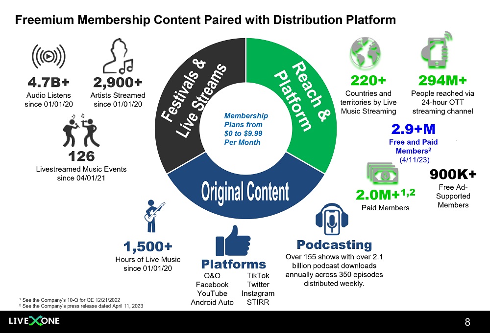 2.0M+ 1 ,2 Paid Members 4.7B+ Audio Listens s i n c e 01/01/20 126 Livestreamed Music Events since 04/01/21 2,900+ Artists Streamed since 01/01/20 220+ Countries and territories by Live Music Streaming 294M+ People reached via 24 - hour OTT streaming channel 1,500+ Hours of Live Music since 01/01/20 Pl at f or ms T i k T o k T w i tt e r In s ta g r am STIRR O&O Facebook YouTube And r o i d Auto Podcasting Over 155 shows with over 2.1 billion podcast downloads annually across 350 episodes distributed weekly. 1 See the Company's 10 - Q for QE 12/21/2022 2 See the Company’s press release dated April 11, 2023 Freemium Membership Content Paired with Distribution Platform M em b e rs h ip Plans from $0 to $9.99 Per Month Supp o r ted Members 2.9+M Free and Paid Members 2 (4/11/23) 900K+ Free Ad - 8