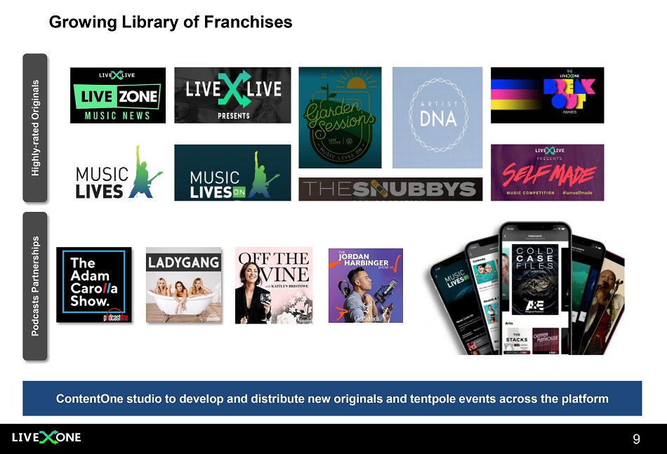 LiveOne’s Slacker Radio is a membership music streaming service offering songs and access to expertly crafted stations, podcasts from PodcastOne, livestreamed video and on - demand programming, and livestreamed festivals, concerts and pay - per - view (PPV) events • Slacker and Roth CH Acquisition V Co. (Nasdaq: ROCL) Announced in April 2023 a Letter of Intent to Merge – Deal is Expected to Value Slacker at $160 Million Pre - Money 1 • Nearly all new Tesla EVs sold in the U.S. come with a paid membership to LiveOne’s Slacker which is paid by Tesla. Tesla's annual agreement with Slacker was recently renewed for the 9th consecutive year. • Paid members grew by 592K – a 45% increase to over 2 million paid members for fiscal 2023. 177K Tesla members added in the quarter ended 3/31/2023. Total members (paid and free ad - supported) as of 3/31/2023 were 2.9M 2 • LiveOne expects 3.75 million total members this year 2 • Ranked as the best quality music app and “Editor’s Choice” by PC Magazine, outpacing better known brands such as Spotify and SiriusXM • Blends a team of forward - thinking music curators and content programmers with cutting edge analytics which provide a seamless music discovery • Estimated music subscription global TAM currently at over 300 million paid music subscribers - estimated to grow to 1.2 billion by 2030 3 30M+ Songs in catalogue 500+ Expertly crafted stations, podcasts, concerts, PPV events 4.7B+ Audio Listens since 01/01/20 64B+ Audio listens since inception 85+ Automobiles partnerships for in - built music streaming $ 2.0M+ 2 Paid Members (4/11/2023) 1 See the Company's press release dated April 28 , 2023 2 See the Company's press release dated April 11 , 2023 3 Broker Research 8