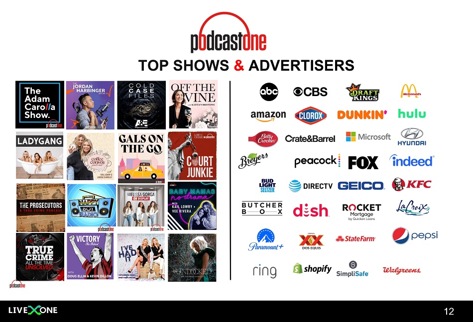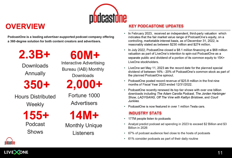 OVE R VIEW PodcastOne is a leading advertiser - supported podcast company offering a 360 - degree solution for both content creators and advertisers. 2.3B+ Down l oads Annually 350+ Hours Distributed Weekly 155+ Podcast Shows 60M+ I n t e r ac ti v e A d v e rti s i ng Bureau (IAB) Monthly Downloads 2,000+ Fortune 1000 Advertisers 14M+ Monthly Unique Listeners • In February 2023, received an independent, third - party valuation which indicates that the fair market value range of PodcastOne’s equity, on a controlling, marketable interest basis, as of December 31, 2022, is reasonably stated as between $230 million and $274 million. • In July 2022, PodcastOne closed a $8.1 million financing at a $68 million valuation as part of LiveOne’s intention to spin - out PodcastOne as a separate public and dividend of a portion of its common equity to 15K+ LiveOne stockholders . • LiveOne set May 11, 2023 as the record date for the planned special dividend of between 16% - 20% of PodcastOne’s common stock as part of the planned PodcastOne spinout. • PodcastOne posted record revenue of $25.8 million in the first nine months of Fiscal Year 2023 ended 12/31/2022. • PodcastOne recently renewed its top tier shows with over one billion downloads including The Adam Carolla Podcast, The Jordan Harbinger Show, LADYGANG, Off The Vine with Kaitlyn Bristowe , and Court Junkies. • PodcastOne is now featured in over 1 million Tesla cars. INDUSTRY STATS • 177M people listen to podcasts • Analyst predict podcast ad spending in 2023 to exceed $2 Billion and $3 Billion in 2026 • 67% of podcast audience feel close to the hosts of podcasts • 61% consider podcasts as part of their daily routine KEY PODCASTONE UPDATES 11