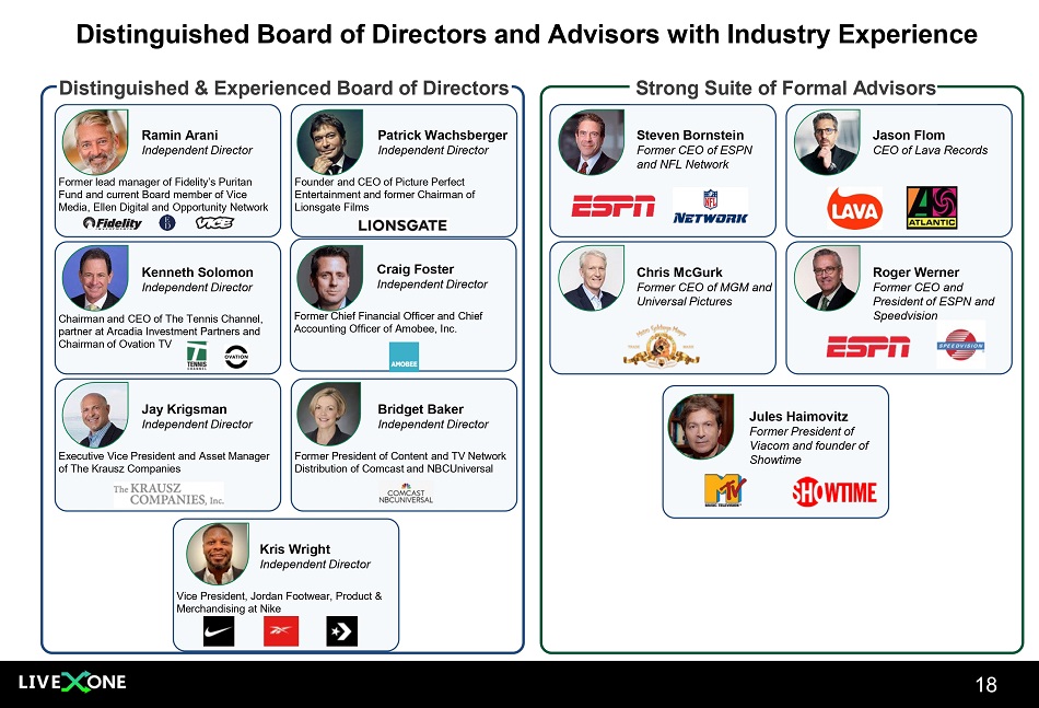 Rob er t Ellin Chairman & CEO Over 30 years of investment and turnaround experience, deep relationships in media and entertainment, prior public company experience as Executive Chairman of Mandalay Digital Kit Gray P re s ident P od c a s t O ne Founded PodcastOne 8 years ago. 20+ years audio experience. Selected to 22 Top Influencers in Podcasting (Podcast Magazine 2022) Jacki e S tone CMO Top 50 Marketer with over 27 years of global expertise across brand building, growth, acquisition and loyalty Alex Brough Chief Revenue Officer Previously held management positions for ad and sponsorship sales at iHeart and Viacom/MTV Management Team Aaron Sullivan VP, Interim CFO Seasoned executive with extensive financial, mergers and acquisitions and operational experience in managing and scaling organizations, as well with financial reporting and internal controls Sue McNamara EVP, Sales PodcastOne 20+ years in Radio & Podcast Sales. Formerly CBS Radio’s Senior Vide President of Advertising Sales John Semmelhack President , CPS 30+ years leading direct marketing companies. Founded Custom Personalization 10 years ago. 17