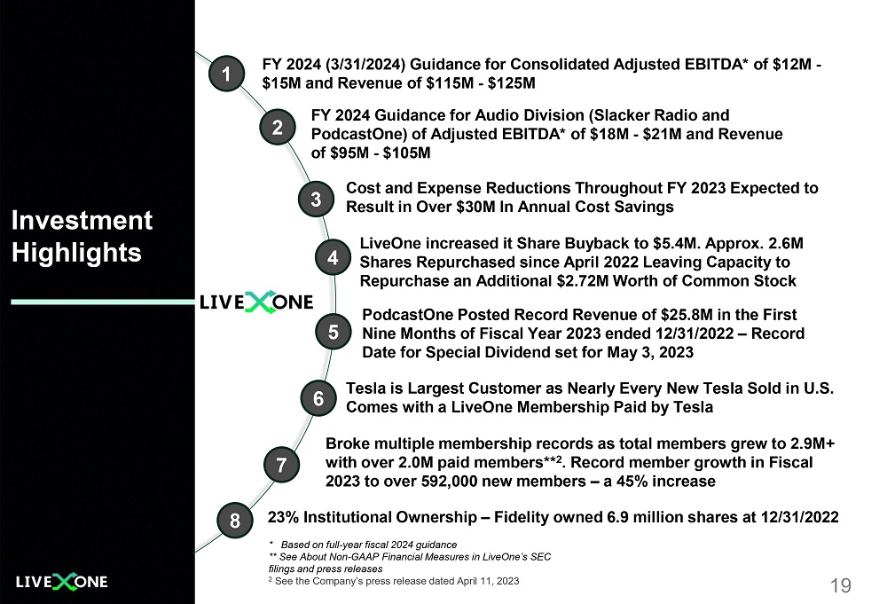 I nves t m ent Highlights Cost and Expense Reductions Throughout FY 2023 Expected to Result in Over $30M In Annual Cost Savings Broke multiple membership records as total members grew to 2.9M+ with over 2.0M paid members** 2 . Record member growth in Fiscal 2023 to over 592,000 new members – a 45% increase Tesla is Largest Customer as Nearly Every New Tesla Sold in U.S. Comes with a LiveOne Membership Paid by Tesla 19 3 5 7 FY 2024 (3/31/2024) Guidance for Consolidated Adjusted EBITDA* of $12M - $15M and Revenue of $115M - $125M 1 2 8 LiveOne increased it Share Buyback to $5.4M. Approx. 2.6M Shares Repurchased since April 2022 Leaving Capacity to Repurchase an Additional $2.72M Worth of Common Stock 4 FY 2024 Guidance for Audio Division (Slacker Radio and PodcastOne) of Adjusted EBITDA* of $18M - $21M and Revenue of $95M - $105M 6 23% Institutional Ownership – Fidelity owned 6.9 million shares at 12/31/2022 * Based on full - year fiscal 2024 guidance ** See About Non - GAAP Financial Measures in LiveOne’s SEC filings and press releases PodcastOne Posted Record Revenue of $25.8M in the First Nine Months of Fiscal Year 2023 ended 12/31/2022 – Record Date for Special Dividend set for May 3, 2023 2 See the Company’s press release dated April 11, 2023