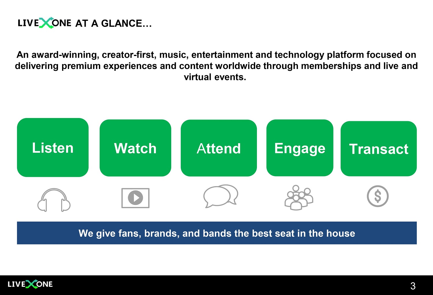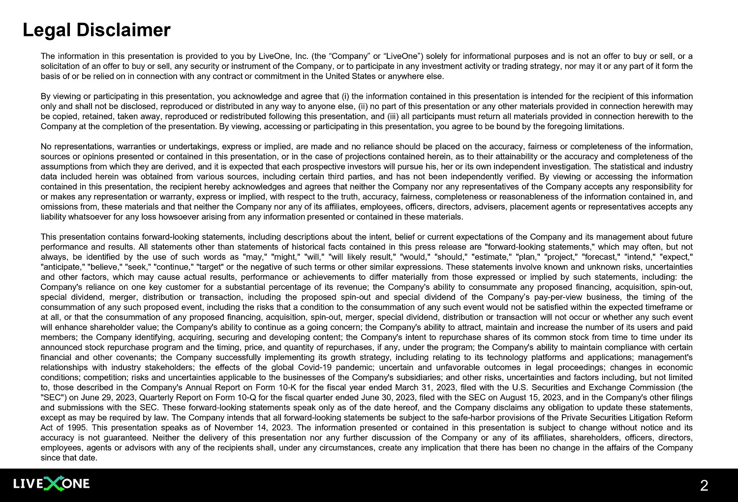 2 The information in this presentation is provided to you by LiveOne, Inc . (the “Company” or “LiveOne”) solely for informational purposes and is not an offer to buy or sell, or a solicitation of an offer to buy or sell, any security or instrument of the Company, or to participate in any investment activity or trading strategy, nor may it or any part of it form the basis of or be relied on in connection with any contract or commitment in the United States or anywhere else . By viewing or participating in this presentation, you acknowledge and agree that (i) the information contained in this presentation is intended for the recipient of this information only and shall not be disclosed, reproduced or distributed in any way to anyone else, (ii) no part of this presentation or any other materials provided in connection herewith may be copied, retained, taken away, reproduced or redistributed following this presentation, and (iii) all participants must return all materials provided in connection herewith to the Company at the completion of the presentation . By viewing, accessing or participating in this presentation, you agree to be bound by the foregoing limitations . No representations, warranties or undertakings, express or implied, are made and no reliance should be placed on the accuracy, fairness or completeness of the information, sources or opinions presented or contained in this presentation, or in the case of projections contained herein, as to their attainability or the accuracy and completeness of the assumptions from which they are derived, and it is expected that each prospective investors will pursue his, her or its own independent investigation . The statistical and industry data included herein was obtained from various sources, including certain third parties, and has not been independently verified . By viewing or accessing the information contained in this presentation, the recipient hereby acknowledges and agrees that neither the Company nor any representatives of the Company accepts any responsibility for or makes any representation or warranty, express or implied, with respect to the truth, accuracy, fairness, completeness or reasonableness of the information contained in, and omissions from, these materials and that neither the Company nor any of its affiliates, employees, officers, directors, advisers, placement agents or representatives accepts any liability whatsoever for any loss howsoever arising from any information presented or contained in these materials . This presentation contains forward - looking statements, including descriptions about the intent, belief or current expectations of the Company and its management about future performance and results . All statements other than statements of historical facts contained in this press release are "forward - looking statements," which may often, but not always, be identified by the use of such words as "may," "might," "will," "will likely result," "would," "should," "estimate," "plan," "project," "forecast," "intend," "expect," "anticipate," "believe," "seek," "continue," "target" or the negative of such terms or other similar expressions . These statements involve known and unknown risks, uncertainties and other factors, which may cause actual results, performance or achievements to differ materially from those expressed or implied by such statements, including : the Company's reliance on one key customer for a substantial percentage of its revenue ; the Company's ability to consummate any proposed financing, acquisition, spin - out, special dividend, merger, distribution or transaction, including the proposed spin - out and special dividend of the Company’s pay - per - view business, the timing of the consummation of any such proposed event, including the risks that a condition to the consummation of any such event would not be satisfied within the expected timeframe or at all, or that the consummation of any proposed financing, acquisition, spin - out, merger, special dividend, distribution or transaction will not occur or whether any such event will enhance shareholder value ; the Company's ability to continue as a going concern ; the Company's ability to attract, maintain and increase the number of its users and paid members ; the Company identifying, acquiring, securing and developing content ; the Company's intent to repurchase shares of its common stock from time to time under its announced stock repurchase program and the timing, price, and quantity of repurchases, if any, under the program ; the Company's ability to maintain compliance with certain financial and other covenants ; the Company successfully implementing its growth strategy, including relating to its technology platforms and applications ; management's relationships with industry stakeholders ; the effects of the global Covid - 19 pandemic ; uncertain and unfavorable outcomes in legal proceedings ; changes in economic conditions ; competition ; risks and uncertainties applicable to the businesses of the Company's subsidiaries ; and other risks, uncertainties and factors including, but not limited to, those described in the Company's Annual Report on Form 10 - K for the fiscal year ended March 31 , 2023 , filed with the U . S . Securities and Exchange Commission (the "SEC") on June 29 , 2023 , Quarterly Report on Form 10 - Q for the fiscal quarter ended June 30 , 2023 , filed with the SEC on August 15 , 2023 , and in the Company's other filings and submissions with the SEC . These forward - looking statements speak only as of the date hereof, and the Company disclaims any obligation to update these statements, except as may be required by law . The Company intends that all forward - looking statements be subject to the safe - harbor provisions of the Private Securities Litigation Reform Act of 1995 . This presentation speaks as of November 14 , 2023 . The information presented or contained in this presentation is subject to chang