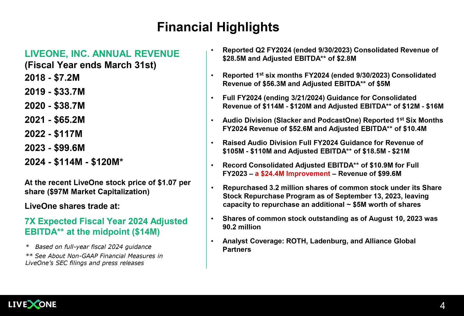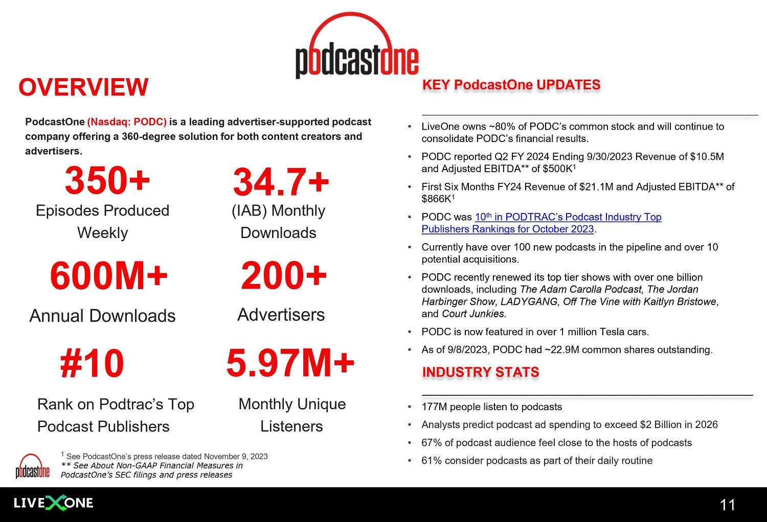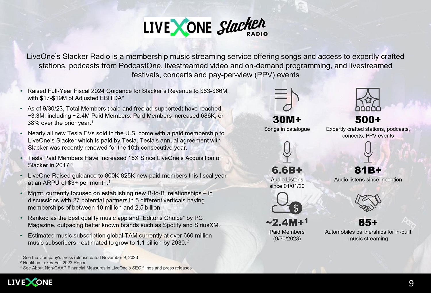 LiveOne’s Slacker Radio is a membership music streaming service offering songs and access to expertly crafted stations, podcasts from PodcastOne, livestreamed video and on - demand programming, and livestreamed festivals, concerts and pay - per - view (PPV) events • Raised Full - Year Fiscal 2024 Guidance for Slacker’s Revenue to $63 - $66M, with $17 - $19M of Adjusted EBITDA* • As of 9/30/23, Total Members (paid and free ad - supported) have reached ~3.3M, including ~2.4M Paid Members. Paid Members increased 686K, or 38% over the prior year. 1 • Nearly all new Tesla EVs sold in the U.S. come with a paid membership to LiveOne’s Slacker which is paid by Tesla. Tesla's annual agreement with Slacker was recently renewed for the 10th consecutive year. • Tesla Paid Members Have Increased 15X Since LiveOne’s Acquisition of Slacker in 2017. 1 • LiveOne Raised guidance to 800K - 825K new paid members this fiscal year at an ARPU of $3+ per month. 1 • Mgmt. currently focused on establishing new B - to - B relationships – in discussions with 27 potential partners in 5 different verticals having memberships of between 10 million and 2.5 billion. • Ranked as the best quality music app and “Editor’s Choice” by PC Magazine, outpacing better known brands such as Spotify and SiriusXM. • Estimated music subscription global TAM currently at over 660 million music subscribers - estimated to grow to 1.1 billion by 2030. 2 30M+ Songs in catalogue 500+ Expertly crafted stations, podcasts, concerts, PPV events 6.6B+ Audio Listens since 01/01/20 81B+ Audio listens since inception ~2.4M+ 1 Paid Members (9/30/2023) 85+ Automobiles partnerships for in - built music streaming $ 9 1 See the Company's press release dated November 9, 2023 2 Houlihan Lokey Fall 2023 Report * See About Non - GAAP Financial Measures in LiveOne’s SEC filings and press releases