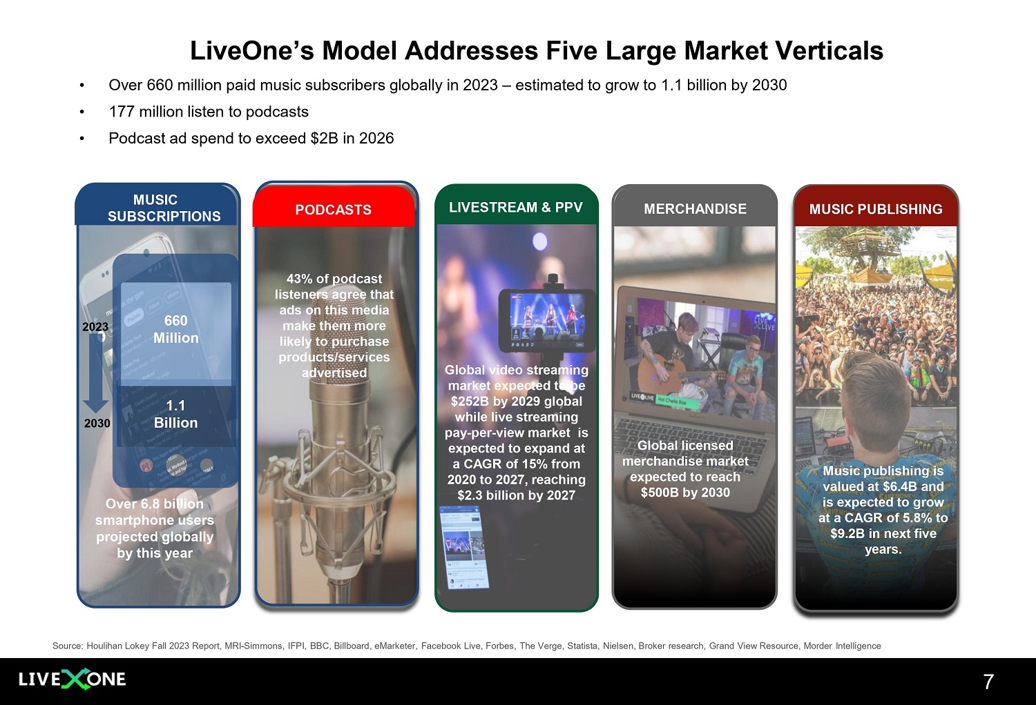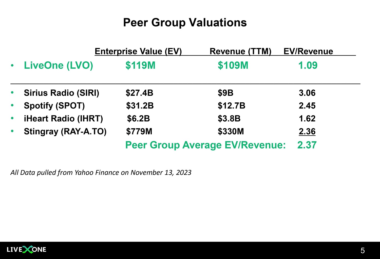 Financial Highlights LIVEONE, INC. ANNUAL REVENUE (Fiscal Year ends March 31st) 2018 - $7.2M 2019 - $33.7M 2020 - $38.7M 2021 - $65.2M 2022 - $117M 2023 - $99.6M 2024 - $114M - $120M* At the recent LiveOne stock price of $1.07 per share ($97M Market Capitalization) LiveOne shares trade at: 7X Expected Fiscal Year 2024 Adjusted EBITDA** at the midpoint ($14M) 4 • Reported Q2 FY2024 (ended 9/30/2023) Consolidated Revenue of $28.5M and Adjusted EBITDA** of $2.8M • Reported 1 st six months FY2024 (ended 9/30/2023) Consolidated Revenue of $56.3M and Adjusted EBITDA** of $5M • F ull FY2024 (ending 3/21/2024) Guidance for Consolidated Revenue of $114M - $120M and Adjusted EBITDA** of $12M - $16M • Audio Division (Slacker and PodcastOne) Reported 1 st Six Months FY2024 Revenue of $52.6M and Adjusted EBITDA** of $10.4M • Raised Audio Division Full FY2024 Guidance for Revenue of $105M - $110M and Adjusted EBITDA** of $18.5M - $21M • Record Consolidated Adjusted EBITDA** of $10.9M for Full FY2023 – a $24.4M Improvement – Revenue of $99.6M • Repurchased 3.2 million shares of common stock under its Share Stock Repurchase Program as of September 13, 2023, leaving capacity to repurchase an additional ~ $5M worth of shares • Shares of common stock outstanding as of August 10, 2023 was 90.2 million • Analyst Coverage: ROTH, Ladenburg, and Alliance Global Partners * Based on full - year fiscal 2024 guidance ** See About Non - GAAP Financial Measures in LiveOne’s SEC filings and press releases