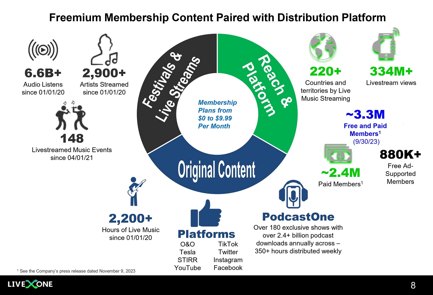 7 Source: Houlihan Lokey Fall 2023 Report, MRI - Simmons, IFPI, BBC, Billboard, eMarketer, Facebook Live, Forbes, The Verge, Statist a, Nielsen, Broker research, Grand View Resource, Morder Intelligence LiveOne’s Model Addresses Five Large Market Verticals • Over 660 million paid music subscribers globally in 2023 – estimated to grow to 1.1 billion by 2030 • 177 million listen to podcasts • Podcast ad spend to exceed $2B in 2026 MUSIC PUBLISHING LIVESTREAM & PPV MERCHANDISE MUSIC SUBSCRIPTIONS Over 6.8 billion smartphone users projected globally by this year 1.1 Billion 660 Million 2030 2023 Global video streaming market expected to be $252B by 2029 global while live streaming pay - per - view market is expected to expand at a CAGR of 15% from 2020 to 2027, reaching $2.3 billion by 2027 Global licensed merchandise market expected to reach $500B by 2030 43% of podcast listeners agree that ads on this media make them more likely to purchase products/services advertised PODCASTS Music publishing is valued at $6.4B and is expected to grow at a CAGR of 5.8% to $9.2B in next five years.