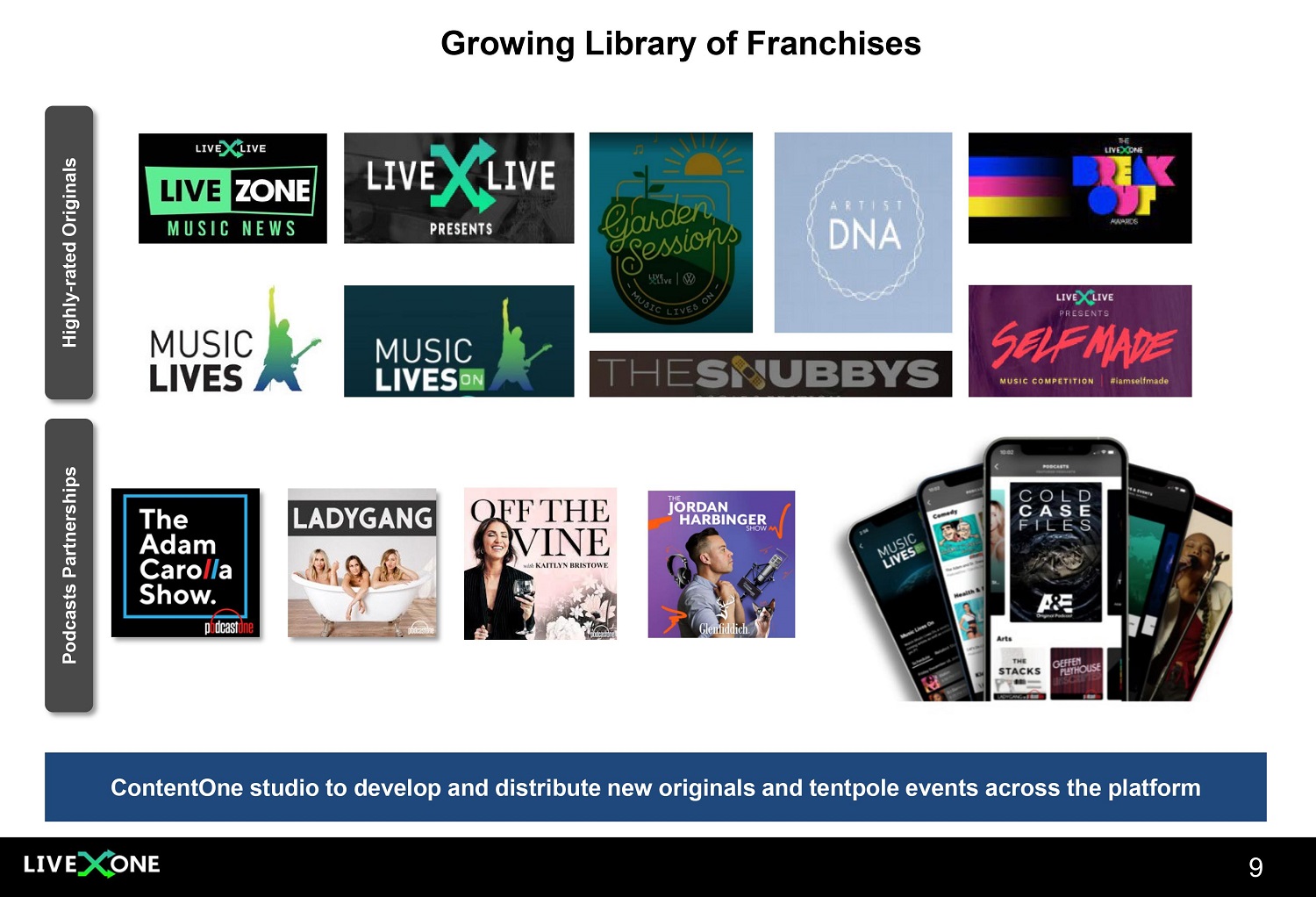 Growing Library of Franchises 9 Highly - rated Originals Podcasts Partnerships ContentOne studio to develop and distribute new originals and tentpole events across the platform