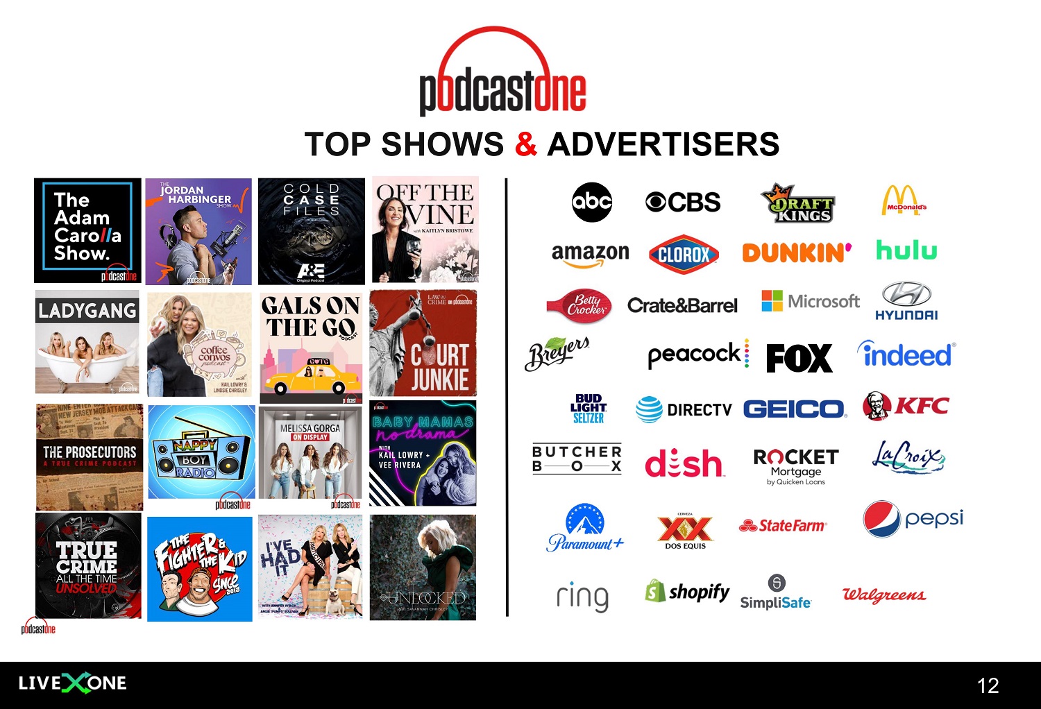 11 OVERVIEW PodcastOne (Nasdaq: PODC) is a leading advertiser - supported podcast company offering a 360 - degree solution for both content creators and advertisers. 200+ Advertisers 350+ 600M+ Annual Downloads Episodes Produced Weekly 5.97M+ 34.7+ (IAB) Monthly Downloads Monthly Unique Listeners • 177M people listen to podcasts • Analysts predict podcast ad spending to exceed $2 Billion in 2026 • 67% of podcast audience feel close to the hosts of podcasts • 61% consider podcasts as part of their daily routine INDUSTRY STATS ____________________________________________ • LiveOne owns ~ 80% of PODC’s common stock and will continue to consolidate PODC’s financial results. • PODC reported Q2 FY 2024 Ending 9/30/2023 Revenue of $10.5M and Adjusted EBITDA** of $500K 1 • First Six Months FY24 Revenue of $21.1M and Adjusted EBITDA** of $866K 1 • PODC was 10 th in PODTRAC’s Podcast Industry Top Publishers Rankings for October 2023 . • Currently have over 100 new podcasts in the pipeline and over 10 potential acquisitions. • PODC recently renewed its top tier shows with over one billion downloads, including The Adam Carolla Podcast, The Jordan Harbinger Show, LADYGANG, Off The Vine with Kaitlyn Bristowe , and Court Junkies. • PODC is now featured in over 1 million Tesla cars. • As of 9/8/2023, PODC had ~22.9M common shares outstanding. KEY PodcastOne UPDATES _______________________________________________________________________________________________________ 1 See PodcastOne’s press release dated November 9, 2023 ** See About Non - GAAP Financial Measures in PodcastOne’s SEC filings and press releases #10 Rank on Podtrac’s Top Podcast Publishers