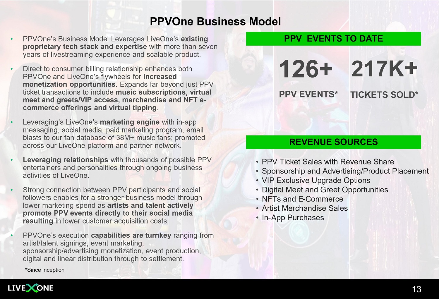 PPVOne Business Model 13 • PPVOne’s Business Model Leverages LiveOne’s existing proprietary tech stack and expertise with more than seven years of livestreaming experience and scalable product. • Direct to consumer billing relationship enhances both PPVOne and LiveOne’s flywheels for increased monetization opportunities . Expands far beyond just PPV ticket transactions to include music subscriptions, virtual meet and greets/VIP access, merchandise and NFT e - commerce offerings and virtual tipping . • Leveraging’s LiveOne’s marketing engine with in - app messaging, social media, paid marketing program, email blasts to our fan database of 38M+ music fans; promoted across our LiveOne platform and partner network. • Leveraging relationships with thousands of possible PPV entertainers and personalities through ongoing business activities of LiveOne. • Strong connection between PPV participants and social followers enables for a stronger business model through lower marketing spend as artists and talent actively promote PPV events directly to their social media resulting in lower customer acquisition costs. • PPVOne’s execution capabilities are turnkey ranging from artist/talent signings, event marketing, sponsorship/advertising monetization, event production, digital and linear distribution through to settlement. 126+ PPV EVENTS* 217K + TICKETS SOLD* PPV EVENTS TO DATE REVENUE SOURCES • PPV Ticket Sales with Revenue Share • Sponsorship and Advertising/Product Placement • VIP Exclusive Upgrade Options • Digital Meet and Greet Opportunities • NFTs and E - Commerce • Artist Merchandise Sales • In - App Purchases *Since inception