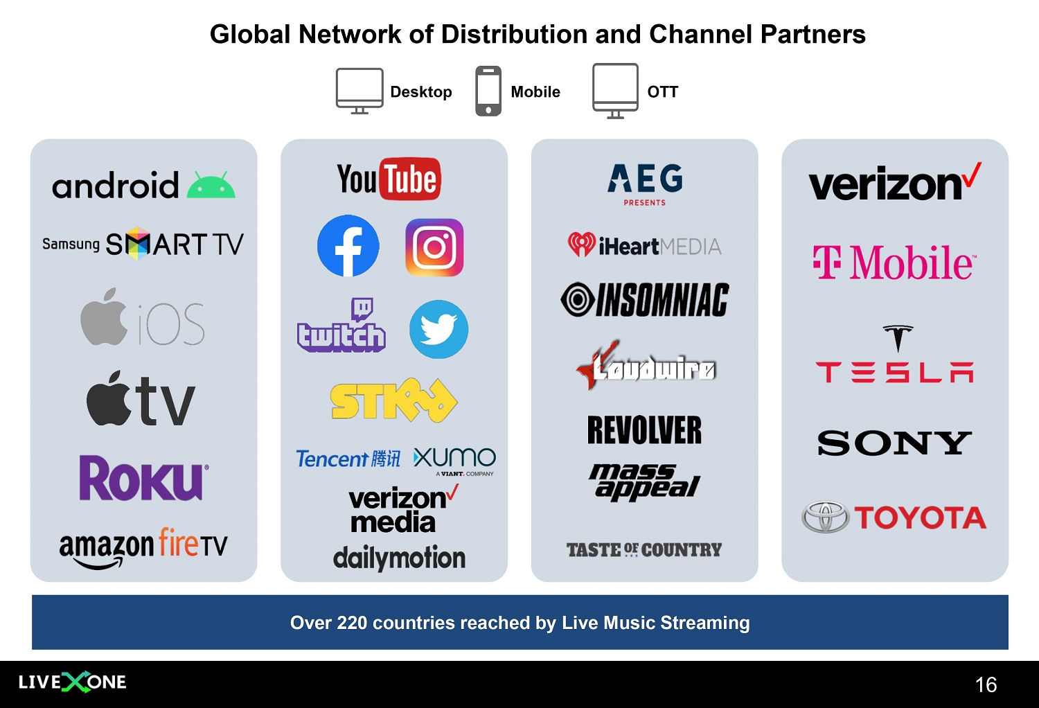 Global Network of Distribution and Channel Partners 16 Desktop Mobile OTT Over 220 countries reached by Live Music Streaming