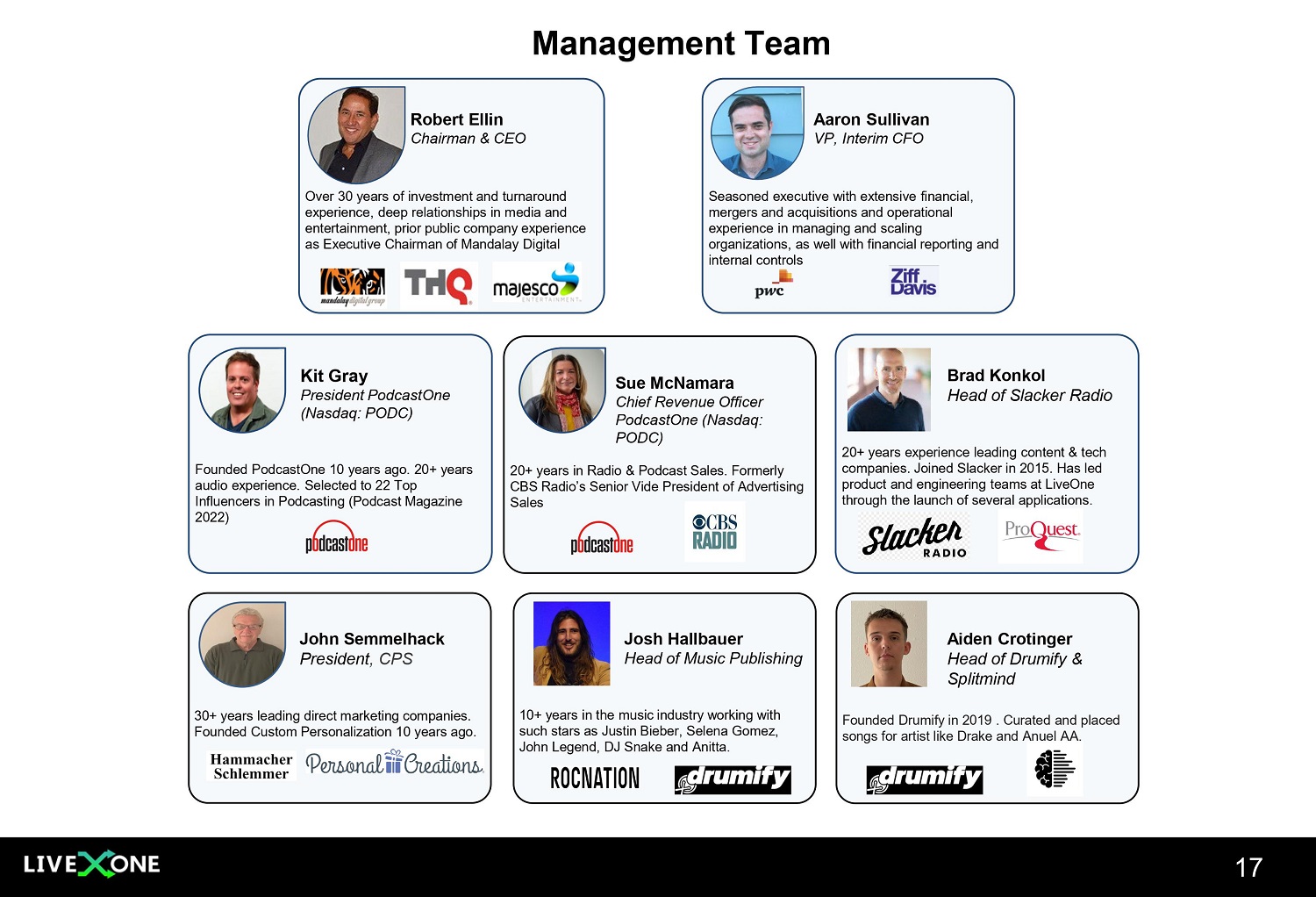 17 Robert Ellin Chairman & CEO Over 30 years of investment and turnaround experience, deep relationships in media and entertainment, prior public company experience as Executive Chairman of Mandalay Digital Kit Gray President PodcastOne (Nasdaq: PODC) Founded PodcastOne 10 years ago. 20+ years audio experience. Selected to 22 Top Influencers in Podcasting (Podcast Magazine 2022) Brad Konkol Head of Slacker Radio 20+ years experience leading content & tech companies. Joined Slacker in 2015. H as led product and engineering teams at LiveOne through the launch of several applications. Management Team Aaron Sullivan VP, Interim CFO Seasoned executive with extensive financial, mergers and acquisitions and operational experience in managing and scaling organizations, as well with financial reporting and internal controls Sue McNamara Chief Revenue Officer PodcastOne (Nasdaq: PODC) 20+ years in Radio & Podcast Sales. Formerly CBS Radio’s Senior Vide President of Advertising Sales John Semmelhack President , CPS 30+ years leading direct marketing companies. Founded Custom Personalization 10 years ago. Josh Hallbauer Head of Music Publishing 10+ years in the music industry working with such stars as Justin Bieber, Selena Gomez, John Legend, DJ Snake and Anitta. Aiden Crotinger Head of Drumify & Splitmind Founded Drumify in 2019 . Curated and placed songs for artist like Drake and Anuel AA.