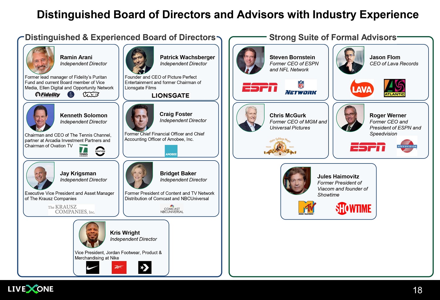 18 Ramin Arani Independent Director Former lead manager of Fidelity’s Puritan Fund and current Board member of Vice Media, Ellen Digital and Opportunity Network Patrick Wachsberger Independent Director Founder and CEO of Picture Perfect Entertainment and former Chairman of Lionsgate Films Steven Bornstein Former CEO of ESPN and NFL Network Jason Flom CEO of Lava Records Distinguished & Experienced Board of Directors Strong Suite of Formal Advisors Kenneth Solomon Independent Director Chairman and CEO of The Tennis Channel, partner at Arcadia Investment Partners and Chairman of Ovation TV Craig Foster Independent Director Former Chief Financial Officer and Chief Accounting Officer of Amobee, Inc. Chris McGurk Former CEO of MGM and Universal Pictures Roger Werner Former CEO and President of ESPN and Speedvision Jay Krigsman Independent Director Executive Vice President and Asset Manager of The Krausz Companies Bridget Baker Independent Director Former President of Content and TV Network Distribution of Comcast and NBCUniversal Jules Haimovitz Former President of Viacom and founder of Showtime Distinguished Board of Directors and Advisors with Industry Experience Kris Wright Independent Director Vice President, Jordan Footwear, Product & Merchandising at Nike