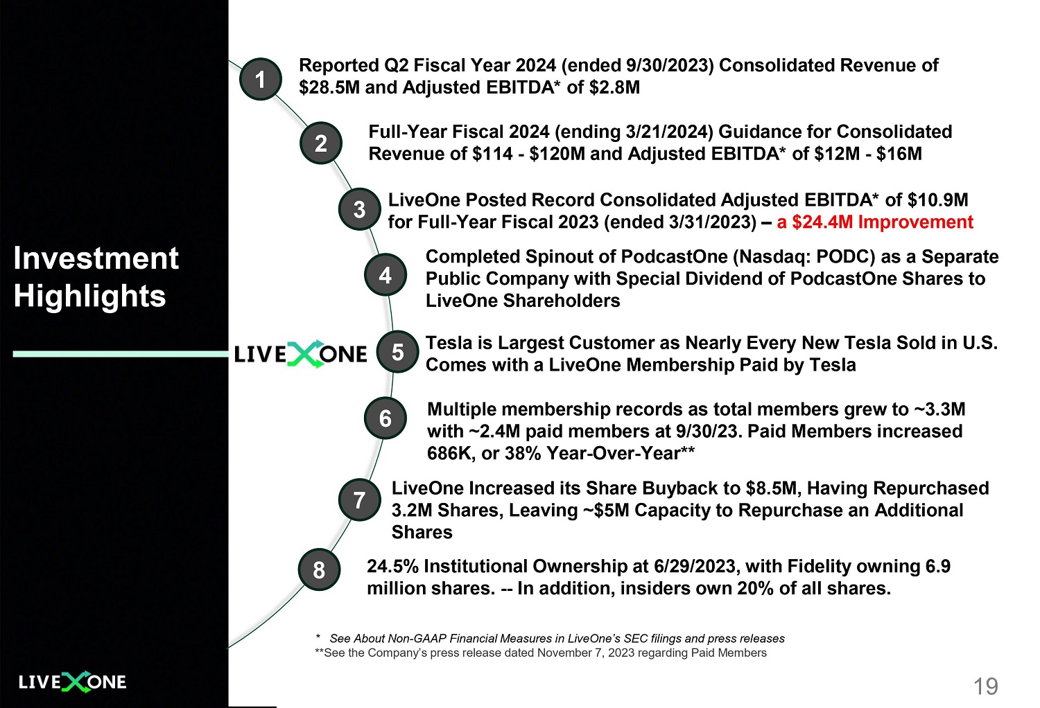 Investment Highlights Multiple membership records as total members grew to ~3.3M with ~2.4M paid members at 9/30/23. Paid Members increased 686K, or 38% Year - Over - Year** Tesla is Largest Customer as Nearly Every New Tesla Sold in U.S. Comes with a LiveOne Membership Paid by Tesla 19 3 5 7 24.5% Institutional Ownership at 6/29/2023, with Fidelity owning 6.9 million shares. -- In addition, insiders own 20% of all shares. Reported Q2 Fiscal Year 2024 (ended 9/30/2023) Consolidated Revenue of $28.5M and Adjusted EBITDA* of $2.8M 1 2 8 LiveOne Increased its Share Buyback to $8.5M, Having Repurchased 3.2M Shares, Leaving ~$5M Capacity to Repurchase an Additional Shares 4 Full - Year Fiscal 2024 (ending 3/21/2024) Guidance for Consolidated Revenue of $114 - $120M and Adjusted EBITDA* of $12M - $16M 6 LiveOne Posted Record Consolidated Adjusted EBITDA* of $10.9M for Full - Year Fiscal 2023 (ended 3/31/2023) – a $24.4M Improvement * See About Non - GAAP Financial Measures in LiveOne’s SEC filings and press releases **See the Company’s press release dated November 7, 2023 regarding Paid Members Completed Spinout of PodcastOne (Nasdaq: PODC) as a Separate Public Company with Special Dividend of PodcastOne Shares to LiveOne Shareholders