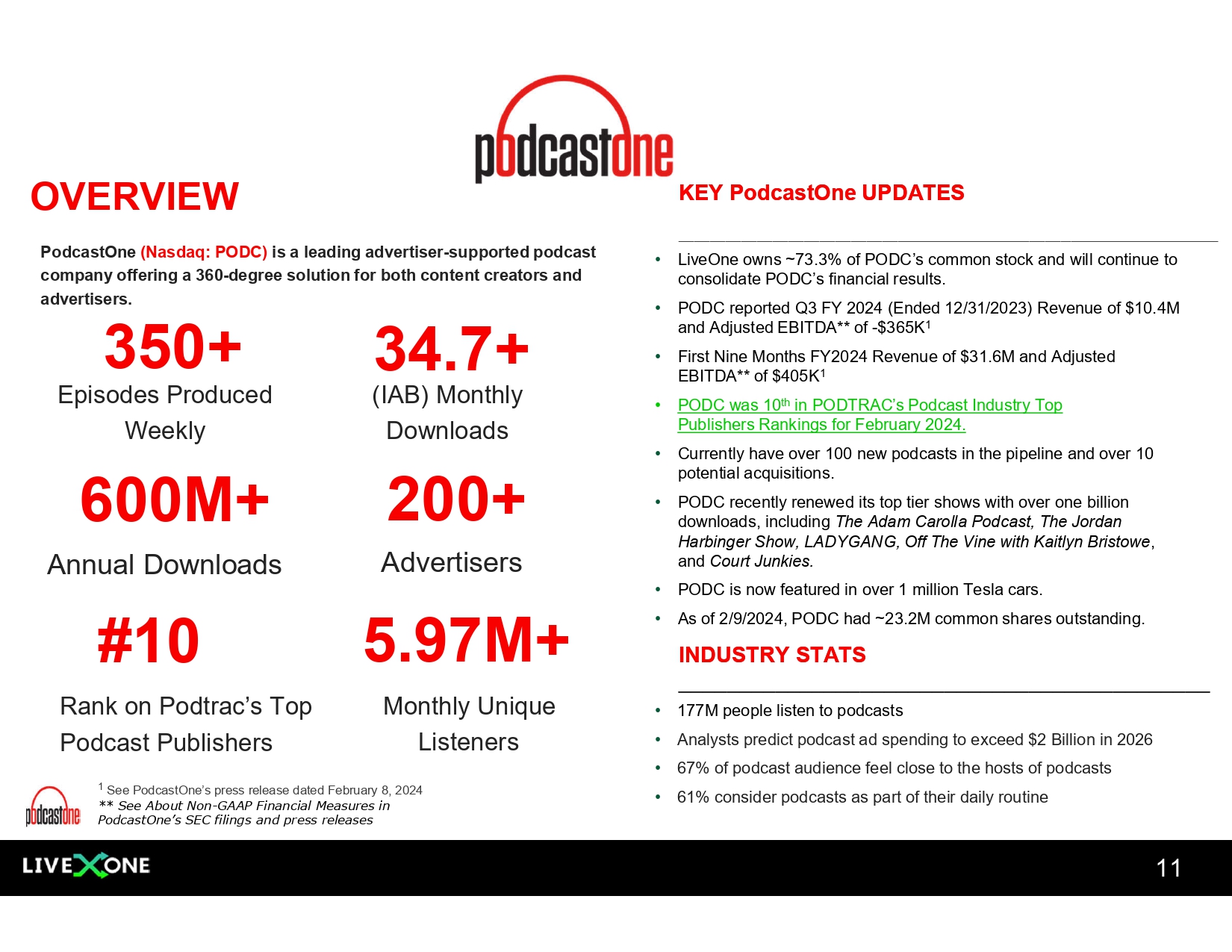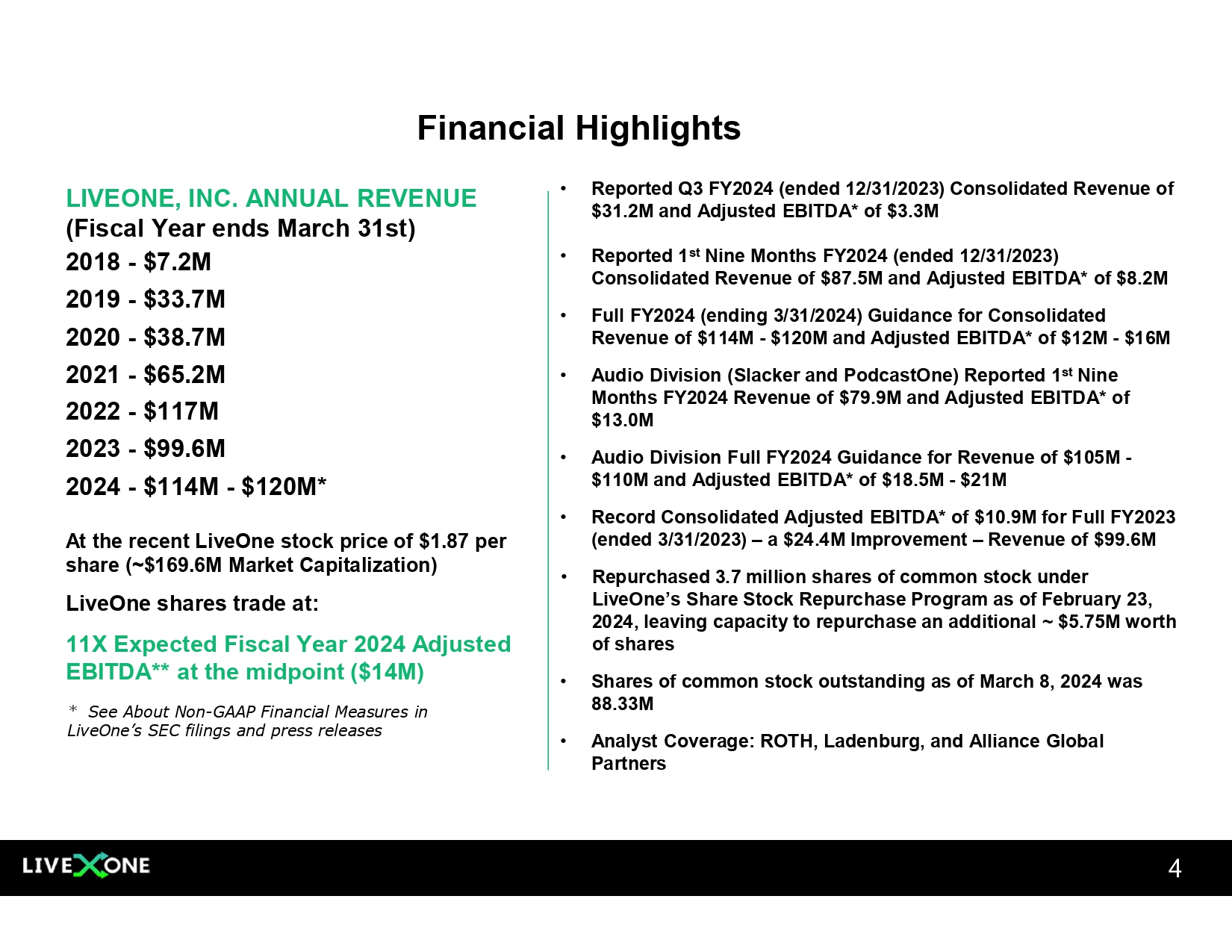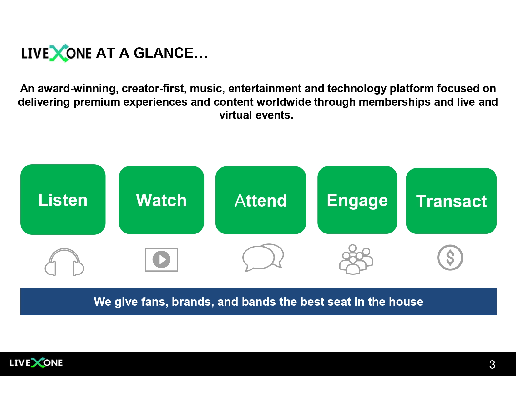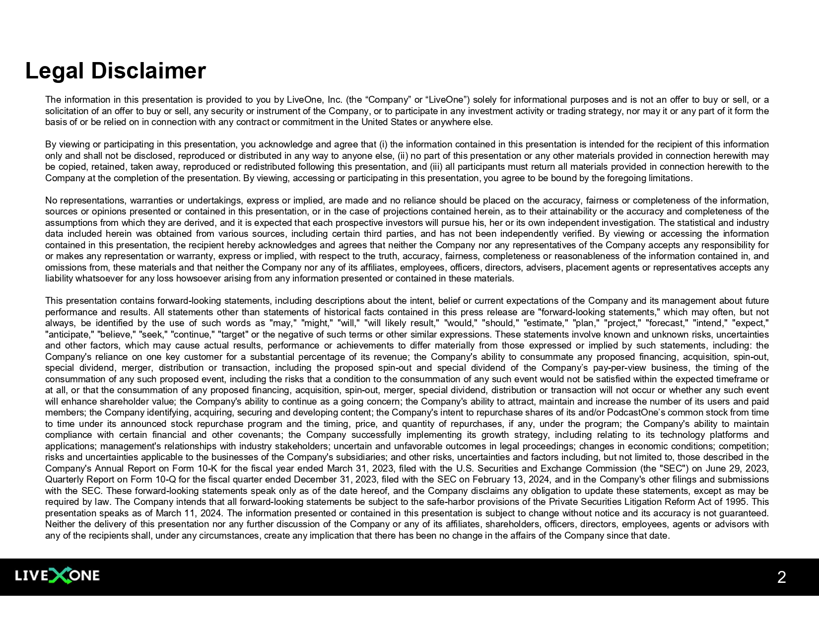 2 The information in this presentation is provided to you by LiveOne, Inc . (the “Company” or “LiveOne”) solely for informational purposes and is not an offer to buy or sell, or a solicitation of an offer to buy or sell, any security or instrument of the Company, or to participate in any investment activity or trading strategy, nor may it or any part of it form the basis of or be relied on in connection with any contract or commitment in the United States or anywhere else . By viewing or participating in this presentation, you acknowledge and agree that (i) the information contained in this presentation is intended for the recipient of this information only and shall not be disclosed, reproduced or distributed in any way to anyone else, (ii) no part of this presentation or any other materials provided in connection herewith may be copied, retained, taken away, reproduced or redistributed following this presentation, and (iii) all participants must return all materials provided in connection herewith to the Company at the completion of the presentation . By viewing, accessing or participating in this presentation, you agree to be bound by the foregoing limitations . No representations, warranties or undertakings, express or implied, are made and no reliance should be placed on the accuracy, fairness or completeness of the information, sources or opinions presented or contained in this presentation, or in the case of projections contained herein, as to their attainability or the accuracy and completeness of the assumptions from which they are derived, and it is expected that each prospective investors will pursue his, her or its own independent investigation . The statistical and industry data included herein was obtained from various sources, including certain third parties, and has not been independently verified . By viewing or accessing the information contained in this presentation, the recipient hereby acknowledges and agrees that neither the Company nor any representatives of the Company accepts any responsibility for or makes any representation or warranty, express or implied, with respect to the truth, accuracy, fairness, completeness or reasonableness of the information contained in, and omissions from, these materials and that neither the Company nor any of its affiliates, employees, officers, directors, advisers, placement agents or representatives accepts any liability whatsoever for any loss howsoever arising from any information presented or contained in these materials . This presentation contains forward - looking statements, including descriptions about the intent, belief or current expectations of the Company and its management about future performance and results . All statements other than statements of historical facts contained in this press release are "forward - looking statements," which may often, but not always, be identified by the use of such words as "may," "might," "will," "will likely result," "would," "should," "estimate," "plan," "project," "forecast," "intend," "expect," "anticipate," "believe," "seek," "continue," "target" or the negative of such terms or other similar expressions . These statements involve known and unknown risks, uncertainties and other factors, which may cause actual results, performance or achievements to differ materially from those expressed or implied by such statements, including : the Company's reliance on one key customer for a substantial percentage of its revenue ; the Company's ability to consummate any proposed financing, acquisition, spin - out, special dividend, merger, distribution or transaction, including the proposed spin - out and special dividend of the Company’s pay - per - view business, the timing of the consummation of any such proposed event, including the risks that a condition to the consummation of any such event would not be satisfied within the expected timeframe or at all, or that the consummation of any proposed financing, acquisition, spin - out, merger, special dividend, distribution or transaction will not occur or whether any such event will enhance shareholder value ; the Company's ability to continue as a going concern ; the Company's ability to attract, maintain and increase the number of its users and paid members ; the Company identifying, acquiring, securing and developing content ; the Company's intent to repurchase shares of its and/or PodcastOne’s common stock from time to time under its announced stock repurchase program and the timing, price, and quantity of repurchases, if any, under the program ; the Company's ability to maintain compliance with certain financial and other covenants ; the Company successfully implementing its growth strategy, including relating to its technology platforms and applications ; management's relationships with industry stakeholders ; uncertain and unfavorable outcomes in legal proceedings ; changes in economic conditions ; competition ; risks and uncertainties applicable to the businesses of the Company's subsidiaries ; and other risks, uncertainties and factors including, but not limited to, those described in the Company's Annual Report on Form 10 - K for the fiscal year ended March 31 , 2023 , filed with the U . S . Securities and Exchange Commission (the "SEC") on June 29 , 2023 , Quarterly Report on Form 10 - Q for the fiscal quarter ended December 31 , 2023 , filed with the SEC on February 13 , 2024 , and in the Company's other filings and submissions with the SEC . These forward - looking statements speak only as of the date hereof, and the Company disclaims any obligation to update these statements, except as may be required by law . The Company intends that all forward - looking statements be subject to the safe - harbor provisions of the Private Securities Litigation Reform Act of 1995 . This presentation speaks as of March 11 , 2024 . The information presented or contained in this presentation is subject to change without notice and it