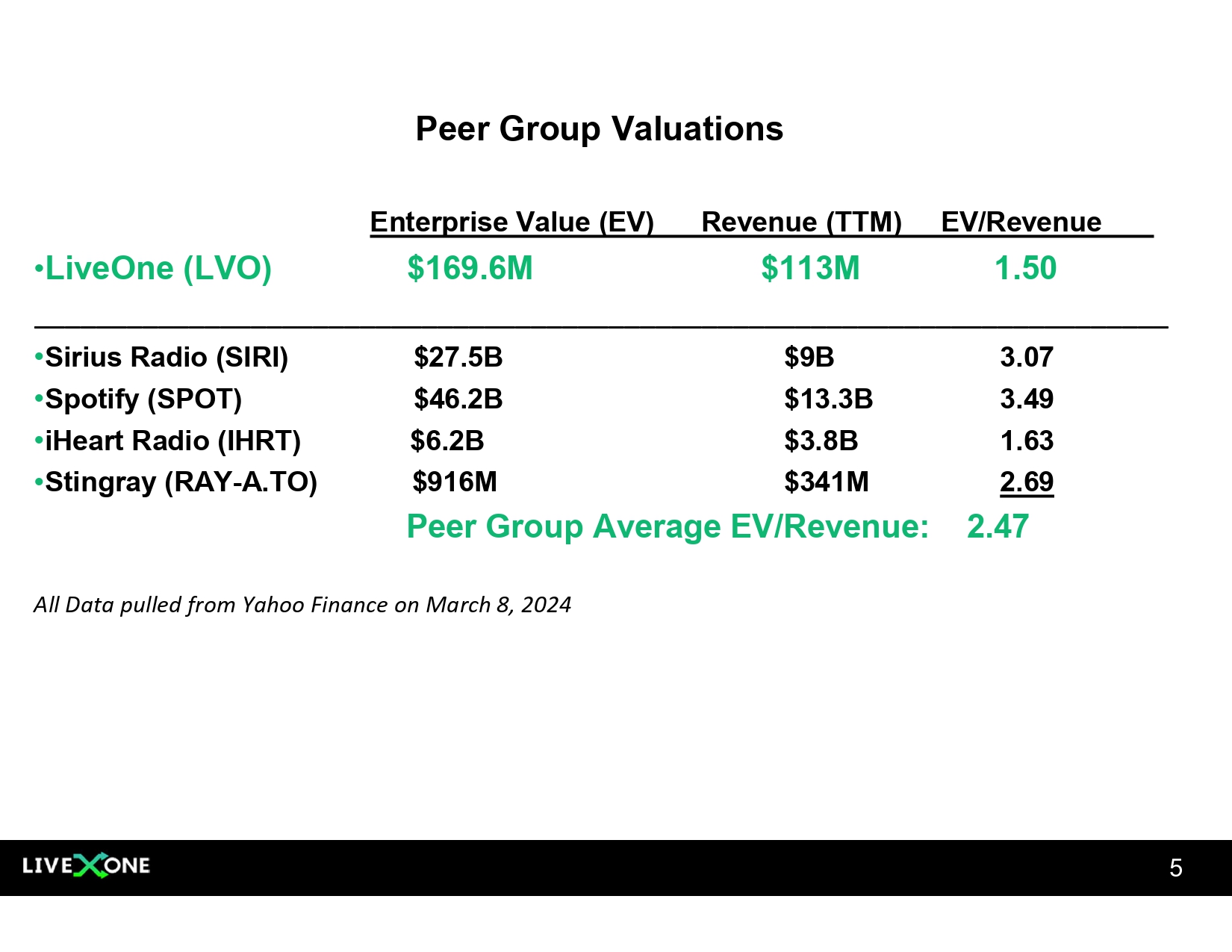 Financial Highlights LIVEONE, INC. ANNUAL REVENUE (Fiscal Year ends March 31st) 2018 - $7.2M 2019 - $33.7M 2020 - $38.7M 2021 - $65.2M 2022 - $117M 2023 - $99.6M 2024 - $114M - $120M* At the recent LiveOne stock price of $1. 87 per share (~$ 169.6 M Market Capitalization) LiveOne shares trade at: 11 X Expected Fiscal Year 2024 Adjusted EBITDA** at the midpoint ($14M) 4 • Reported Q3 FY2024 (ended 12/31/2023) Consolidated Revenue of $31.2M and Adjusted EBITDA* of $3.3M • Reported 1 st Nine Months FY2024 (ended 12/31/2023) Consolidated Revenue of $87.5M and Adjusted EBITDA* of $8.2M • Full FY2024 (ending 3/31/2024) Guidance for Consolidated Revenue of $114M - $120M and Adjusted EBITDA* of $12M - $16M • Audio Division (Slacker and PodcastOne) Reported 1 st Nine Months FY2024 Revenue of $79.9M and Adjusted EBITDA* of $13.0M • Audio Division Full FY2024 Guidance for Revenue of $105M - $110M and Adjusted EBITDA* of $18.5M - $21M • Record Consolidated Adjusted EBITDA* of $10.9M for Full FY2023 (ended 3/31/2023) – a $24.4M Improvement – Revenue of $99.6M • Repurchased 3. 7 million shares of common stock under LiveOne’s Share Stock Repurchase Program as of February 23, 2024 , leaving capacity to repurchase an additional ~ $ 5.75 M worth of shares • Shares of common stock outstanding as of March 8, 2024 was 88 . 33M • Analyst Coverage: ROTH, Ladenburg, and Alliance Global Partners * See About Non - GAAP Financial Measures in LiveOne’s SEC filings and press releases