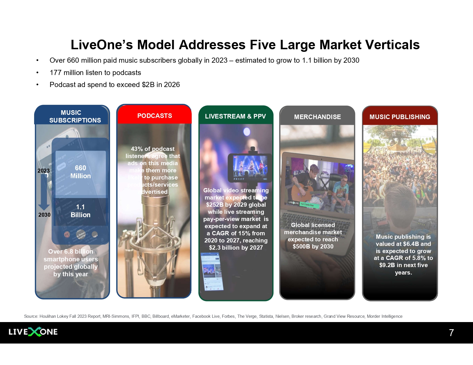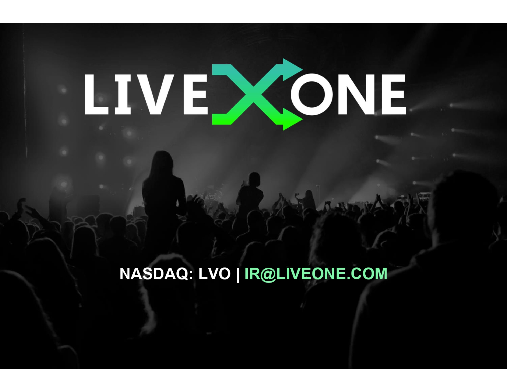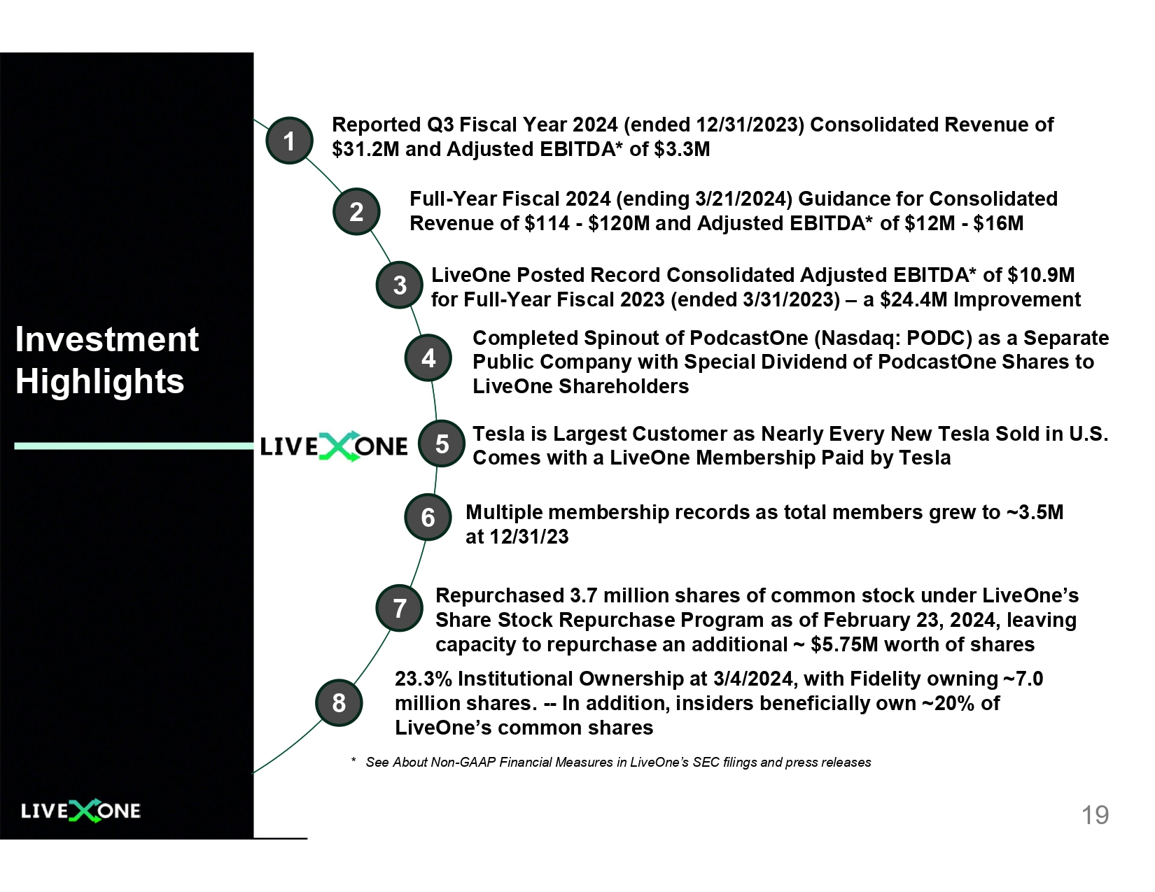 Investment Highlights Multiple membership records as total members grew to ~3.5M at 12/31/23 Tesla is Largest Customer as Nearly Every New Tesla Sold in U.S. Comes with a LiveOne Membership Paid by Tesla 19 3 5 7 2 3 . 3 % Institutional Ownership at 3 / 4 /202 4 , with Fidelity owning ~7.0 million shares. -- In addition, insiders beneficially own ~20% of LiveOne’s common shares Reported Q3 Fiscal Year 2024 (ended 12/31/2023) Consolidated Revenue of $31.2M and Adjusted EBITDA* of $3.3M 1 2 8 Repurchased 3.7 million shares of common stock under LiveOne’s Share Stock Repurchase Program as of February 23, 2024, leaving capacity to repurchase an additional ~ $5.75M worth of shares 4 Full - Year Fiscal 2024 (ending 3/21/2024) Guidance for Consolidated Revenue of $114 - $120M and Adjusted EBITDA* of $12M - $16M 6 LiveOne Posted Record Consolidated Adjusted EBITDA* of $10.9M for Full - Year Fiscal 2023 (ended 3/31/2023) – a $24.4M Improvement * See About Non - GAAP Financial Measures in LiveOne’s SEC filings and press releases Completed Spinout of PodcastOne (Nasdaq: PODC) as a Separate Public Company with Special Dividend of PodcastOne Shares to LiveOne Shareholders