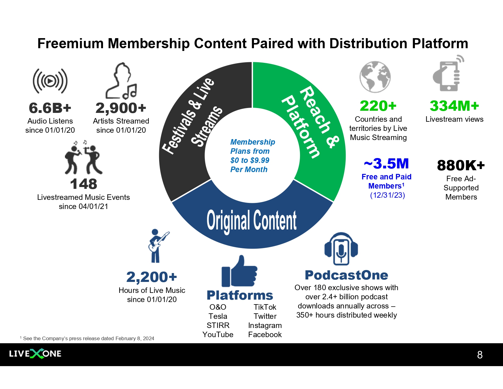 7 Source: Houlihan Lokey Fall 2023 Report, MRI - Simmons, IFPI, BBC, Billboard, eMarketer, Facebook Live, Forbes, The Verge, Statist a, Nielsen, Broker research, Grand View Resource, Morder Intelligence LiveOne’s Model Addresses Five Large Market Verticals • Over 660 million paid music subscribers globally in 2023 – estimated to grow to 1.1 billion by 2030 • 177 million listen to podcasts • Podcast ad spend to exceed $2B in 2026 MUSIC PUBLISHING LIVESTREAM & PPV MERCHANDISE MUSIC SUBSCRIPTIONS Over 6.8 billion smartphone users projected globally by this year 1.1 Billion 660 Million 2030 2023 Global video streaming market expected to be $252B by 2029 global while live streaming pay - per - view market is expected to expand at a CAGR of 15% from 2020 to 2027, reaching $2.3 billion by 2027 Global licensed merchandise market expected to reach $500B by 2030 43% of podcast listeners agree that ads on this media make them more likely to purchase products/services advertised PODCASTS Music publishing is valued at $6.4B and is expected to grow at a CAGR of 5.8% to $9.2B in next five years.