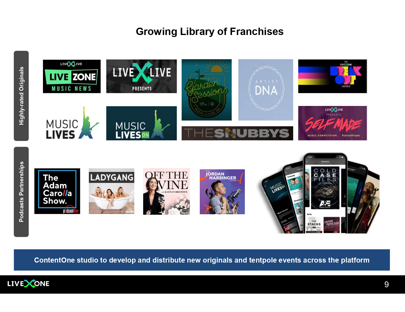 Growing Library of Franchises 9 Highly - rated Originals Podcasts Partnerships ContentOne studio to develop and distribute new originals and tentpole events across the platform
