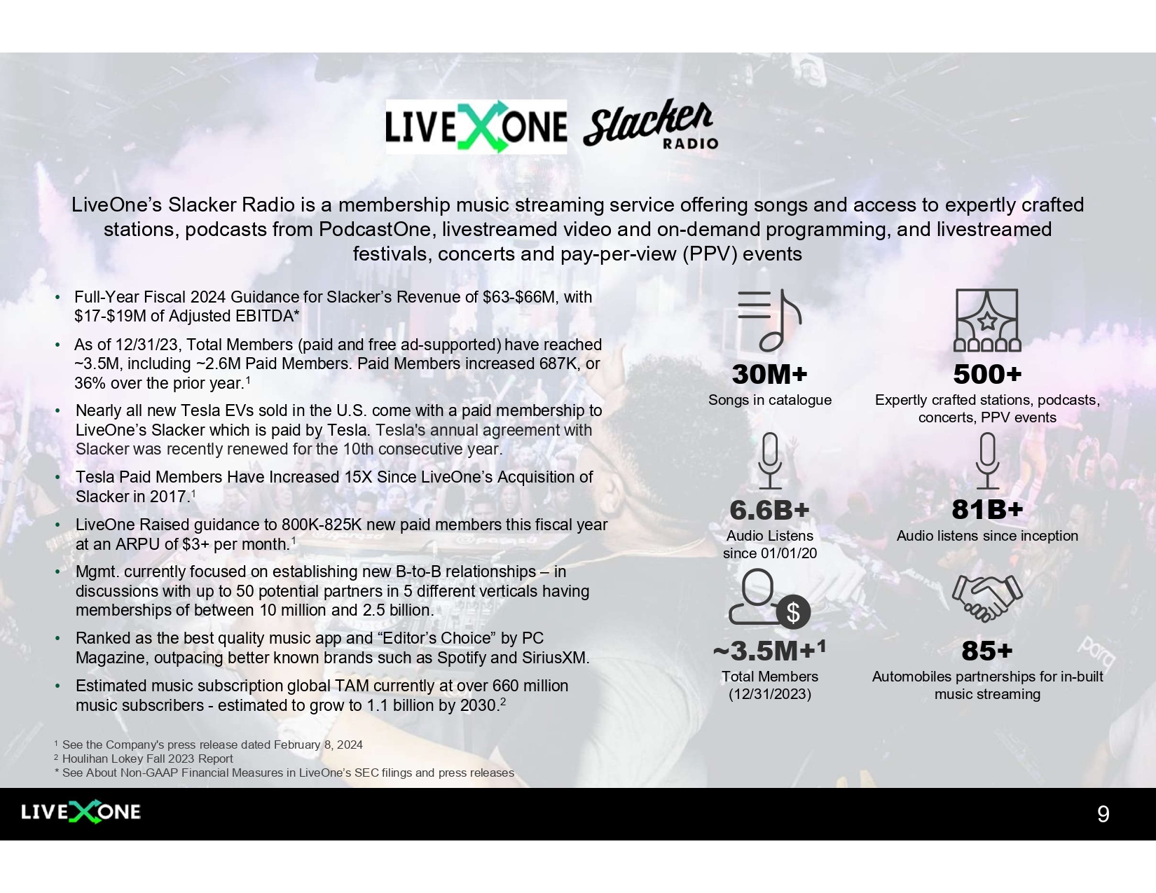 LiveOne’s Slacker Radio is a membership music streaming service offering songs and access to expertly crafted stations, podcasts from PodcastOne, livestreamed video and on - demand programming, and livestreamed festivals, concerts and pay - per - view (PPV) events • Full - Year Fiscal 2024 Guidance for Slacker’s Revenue of $63 - $66M, with $17 - $19M of Adjusted EBITDA* • As of 12/31/23, Total Members (paid and free ad - supported) have reached ~3.5M, including ~2.6M Paid Members. Paid Members increased 687K, or 36% over the prior year. 1 • Nearly all new Tesla EVs sold in the U.S. come with a paid membership to LiveOne’s Slacker which is paid by Tesla. Tesla's annual agreement with Slacker was recently renewed for the 10th consecutive year. • Tesla Paid Members Have Increased 15X Since LiveOne’s Acquisition of Slacker in 2017. 1 • LiveOne Raised guidance to 800K - 825K new paid members this fiscal year at an ARPU of $3+ per month. 1 • Mgmt. currently focused on establishing new B - to - B relationships – in discussions with up to 50 potential partners in 5 different verticals having memberships of between 10 million and 2.5 billion. • Ranked as the best quality music app and “Editor’s Choice” by PC Magazine, outpacing better known brands such as Spotify and SiriusXM. • Estimated music subscription global TAM currently at over 660 million music subscribers - estimated to grow to 1.1 billion by 2030. 2 30M+ Songs in catalogue 500+ Expertly crafted stations, podcasts, concerts, PPV events 6.6B+ Audio Listens since 01/01/20 81B+ Audio listens since inception ~3.5M+ 1 Total Members (12/31/2023) 85+ Automobiles partnerships for in - built music streaming $ 9 1 See the Company's press release dated February 8, 2024 2 Houlihan Lokey Fall 2023 Report * See About Non - GAAP Financial Measures in LiveOne’s SEC filings and press releases