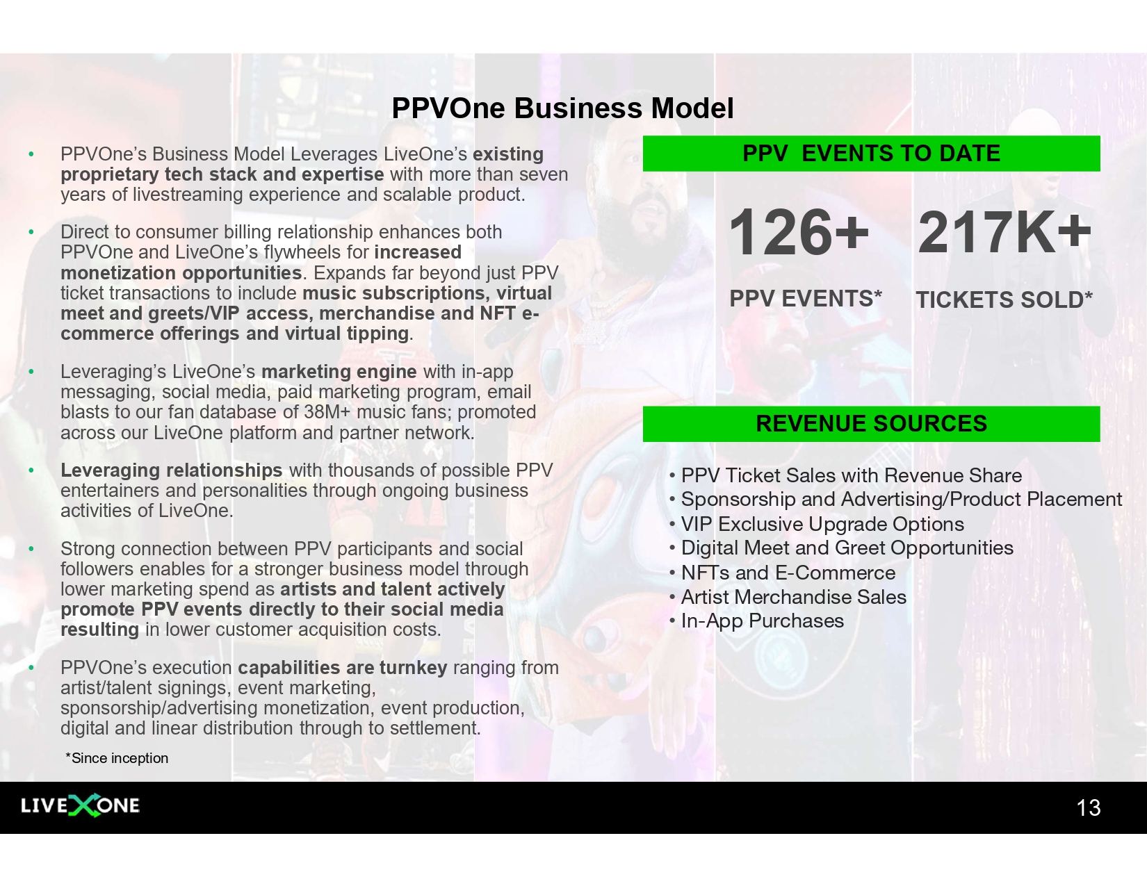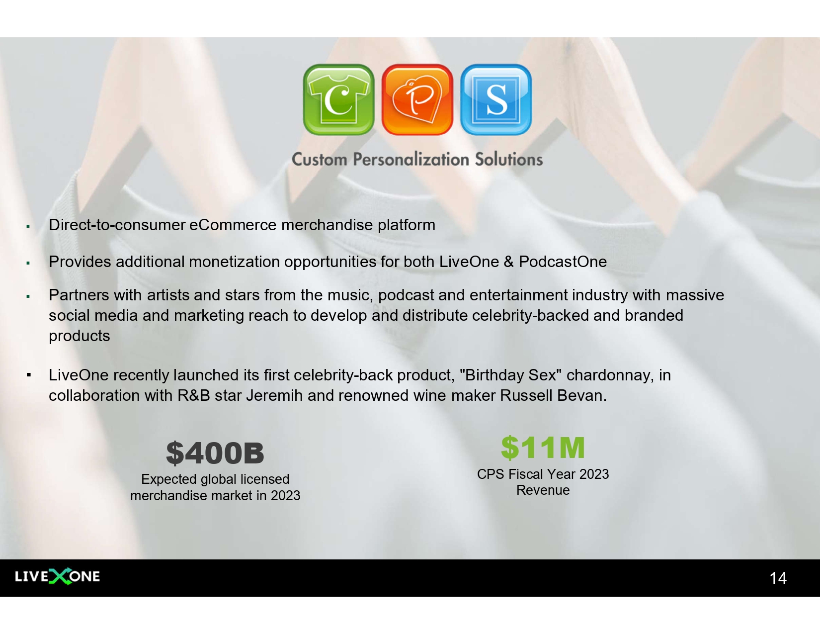 PPVOne Business Model 13 • PPVOne’s Business Model Leverages LiveOne’s existing proprietary tech stack and expertise with more than seven years of livestreaming experience and scalable product. • Direct to consumer billing relationship enhances both PPVOne and LiveOne’s flywheels for increased monetization opportunities . Expands far beyond just PPV ticket transactions to include music subscriptions, virtual meet and greets/VIP access, merchandise and NFT e - commerce offerings and virtual tipping . • Leveraging’s LiveOne’s marketing engine with in - app messaging, social media, paid marketing program, email blasts to our fan database of 38M+ music fans; promoted across our LiveOne platform and partner network. • Leveraging relationships with thousands of possible PPV entertainers and personalities through ongoing business activities of LiveOne. • Strong connection between PPV participants and social followers enables for a stronger business model through lower marketing spend as artists and talent actively promote PPV events directly to their social media resulting in lower customer acquisition costs. • PPVOne’s execution capabilities are turnkey ranging from artist/talent signings, event marketing, sponsorship/advertising monetization, event production, digital and linear distribution through to settlement. 126+ PPV EVENTS* 217K + TICKETS SOLD* PPV EVENTS TO DATE REVENUE SOURCES • PPV Ticket Sales with Revenue Share • Sponsorship and Advertising/Product Placement • VIP Exclusive Upgrade Options • Digital Meet and Greet Opportunities • NFTs and E - Commerce • Artist Merchandise Sales • In - App Purchases *Since inception
