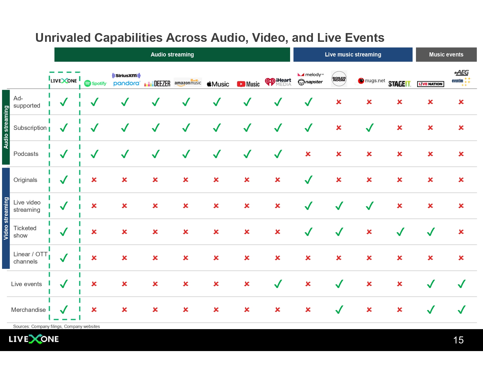 ᴡ ᴡ ᴡ ᴡ ᴡ ✔ ✔ ✔ ✔ ✔ ✔ ✔ ✔ ✔ Ad - supported ᴡ ᴡ ᴡ ✔ ᴡ ✔ ✔ ✔ ✔ ✔ ✔ ✔ ✔ ✔ Subscription ᴡ ᴡ ᴡ ᴡ ᴡ ᴡ ✔ ✔ ✔ ✔ ✔ ✔ ✔ ✔ Podcasts ᴡ ᴡ ᴡ ᴡ ᴡ ✔ ᴡ ᴡ ᴡ ᴡ ᴡ ᴡ ᴡ ✔ Originals ᴡ ᴡ ᴡ ✔ ✔ ✔ ᴡ ᴡ ᴡ ᴡ ᴡ ᴡ ᴡ ✔ Live video streaming ᴡ ✔ ✔ ᴡ ✔ ✔ ᴡ ᴡ ᴡ ᴡ ᴡ ᴡ ᴡ ✔ Ticketed show ᴡ ᴡ ᴡ ᴡ ᴡ ᴡ ᴡ ᴡ ᴡ ᴡ ᴡ ᴡ ᴡ ✔ Linear / OTT channels ✔ ✔ ᴡ ᴡ ✔ ᴡ ✔ ᴡ ᴡ ᴡ ᴡ ᴡ ᴡ ✔ Live events ✔ ✔ ᴡ ᴡ ✔ ᴡ ᴡ ᴡ ᴡ ᴡ ᴡ ᴡ ᴡ ✔ Merchandise Sources: Company filings, Company websites Audio streaming Live music streaming Music events Unrivaled Capabilities Across Audio, Video, and Live Events Audio streaming Video streaming 15