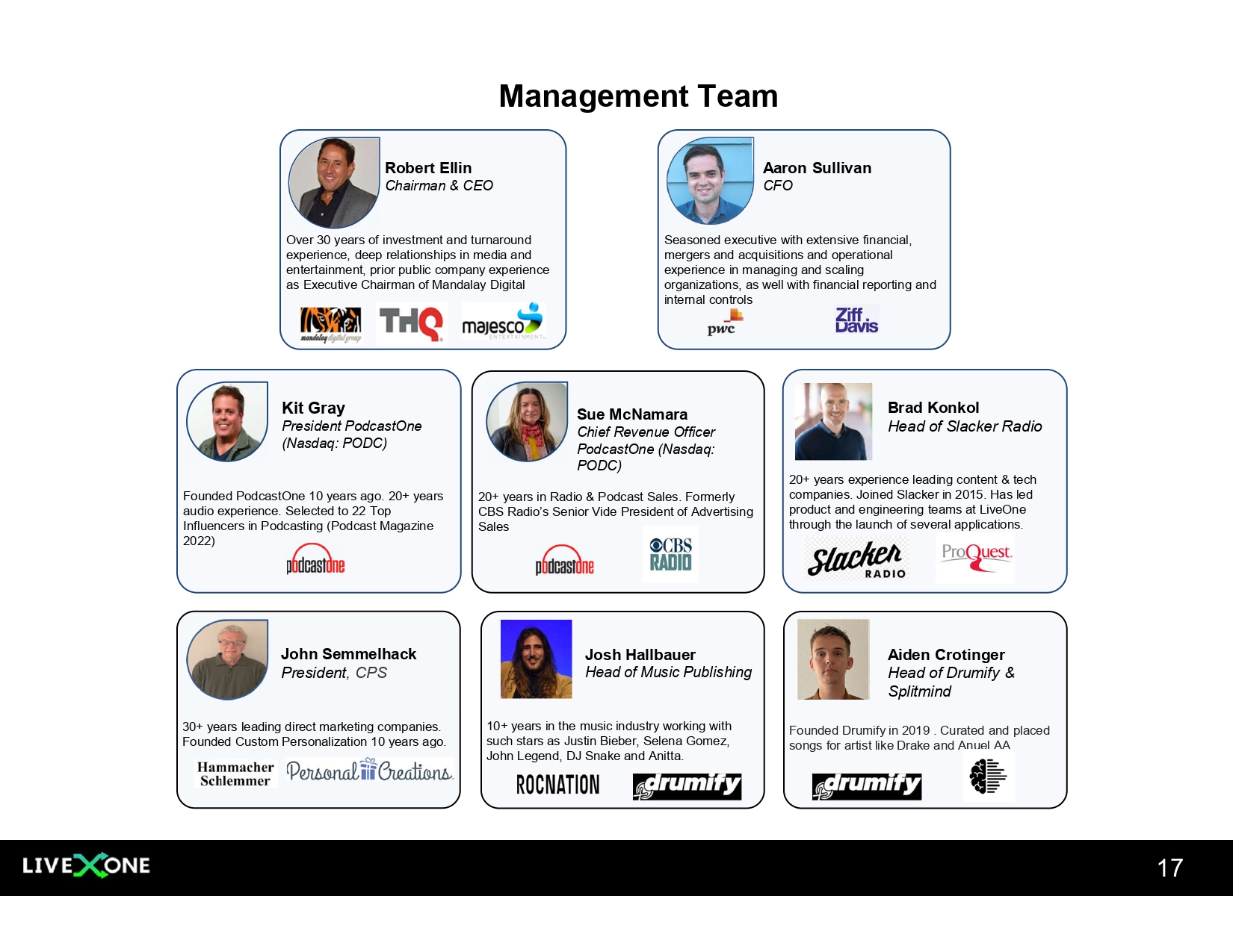 17 Robert Ellin Chairman & CEO Over 30 years of investment and turnaround experience, deep relationships in media and entertainment, prior public company experience as Executive Chairman of Mandalay Digital Kit Gray President PodcastOne (Nasdaq: PODC) Founded PodcastOne 10 years ago. 20+ years audio experience. Selected to 22 Top Influencers in Podcasting (Podcast Magazine 2022) Brad Konkol Head of Slacker Radio 20+ years experience leading content & tech companies. Joined Slacker in 2015. Has led product and engineering teams at LiveOne through the launch of several applications. Management Team Aaron Sullivan CFO Seasoned executive with extensive financial, mergers and acquisitions and operational experience in managing and scaling organizations, as well with financial reporting and internal controls Sue McNamara Chief Revenue Officer PodcastOne (Nasdaq: PODC) 20+ years in Radio & Podcast Sales. Formerly CBS Radio’s Senior Vide President of Advertising Sales John Semmelhack President , CPS 30+ years leading direct marketing companies. Founded Custom Personalization 10 years ago. Josh Hallbauer Head of Music Publishing 10+ years in the music industry working with such stars as Justin Bieber, Selena Gomez, John Legend, DJ Snake and Anitta. Aiden Crotinger Head of Drumify & Splitmind Founded Drumify in 2019 . Curated and placed songs for artist like Drake and Anuel AA.