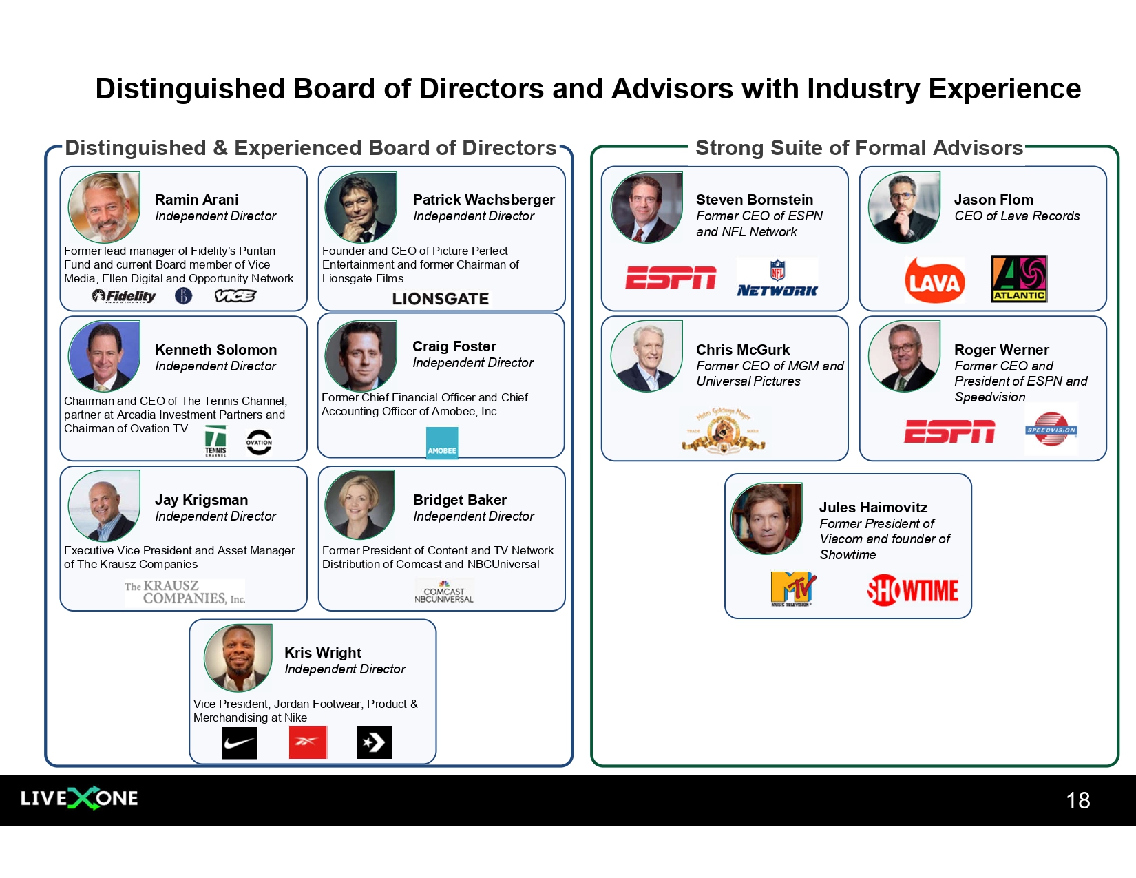 18 Ramin Arani Independent Director Former lead manager of Fidelity’s Puritan Fund and current Board member of Vice Media, Ellen Digital and Opportunity Network Patrick Wachsberger Independent Director Founder and CEO of Picture Perfect Entertainment and former Chairman of Lionsgate Films Steven Bornstein Former CEO of ESPN and NFL Network Jason Flom CEO of Lava Records Distinguished & Experienced Board of Directors Strong Suite of Formal Advisors Kenneth Solomon Independent Director Chairman and CEO of The Tennis Channel, partner at Arcadia Investment Partners and Chairman of Ovation TV Craig Foster Independent Director Former Chief Financial Officer and Chief Accounting Officer of Amobee, Inc. Chris McGurk Former CEO of MGM and Universal Pictures Roger Werner Former CEO and President of ESPN and Speedvision Jay Krigsman Independent Director Executive Vice President and Asset Manager of The Krausz Companies Bridget Baker Independent Director Former President of Content and TV Network Distribution of Comcast and NBCUniversal Jules Haimovitz Former President of Viacom and founder of Showtime Distinguished Board of Directors and Advisors with Industry Experience Kris Wright Independent Director Vice President, Jordan Footwear, Product & Merchandising at Nike
