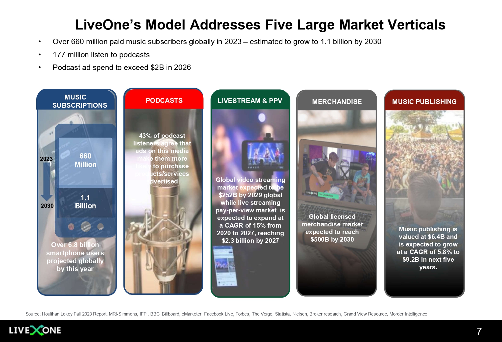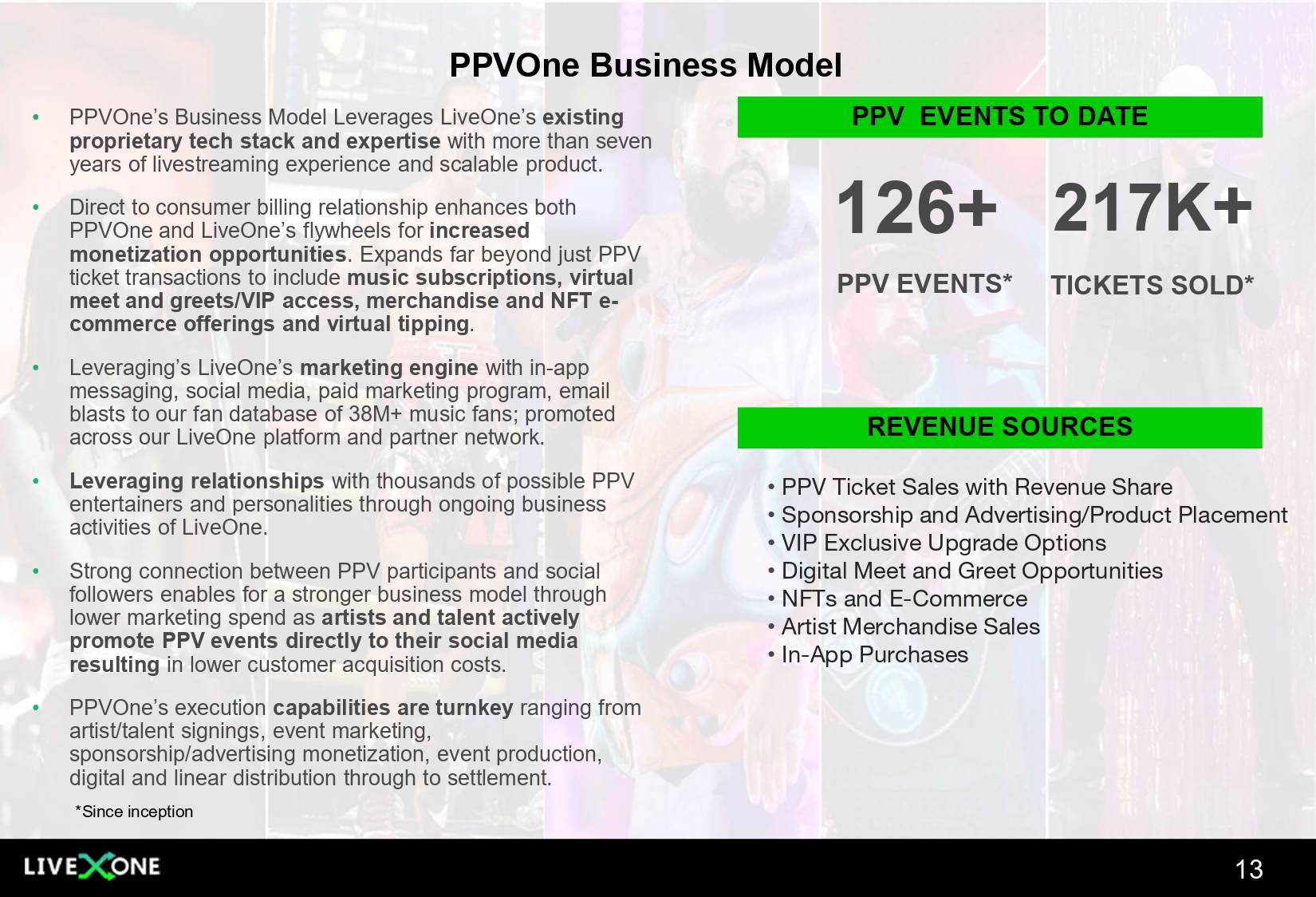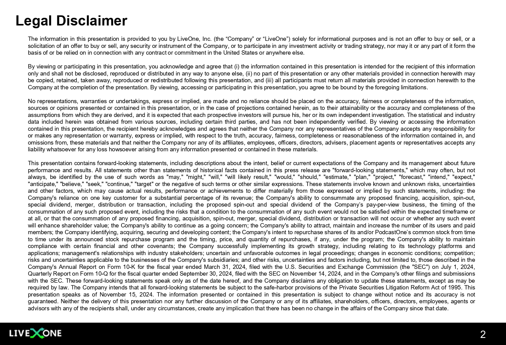 The information in this presentation is provided to you by LiveOne, Inc . (the “Company” or “LiveOne”) solely for informational purposes and is not an offer to buy or sell, or a solicitation of an offer to buy or sell, any security or instrument of the Company, or to participate in any investment activity or trading strategy, nor may it or any part of it form the basis of or be relied on in connection with any contract or commitment in the United States or anywhere else . By viewing or participating in this presentation, you acknowledge and agree that (i) the information contained in this presentation is intended for the recipient of this information only and shall not be disclosed, reproduced or distributed in any way to anyone else, (ii) no part of this presentation or any other materials provided in connection herewith may be copied, retained, taken away, reproduced or redistributed following this presentation, and (iii) all participants must return all materials provided in connection herewith to the Company at the completion of the presentation . By viewing, accessing or participating in this presentation, you agree to be bound by the foregoing limitations . No representations, warranties or undertakings, express or implied, are made and no reliance should be placed on the accuracy, fairness or completeness of the information, sources or opinions presented or contained in this presentation, or in the case of projections contained herein, as to their attainability or the accuracy and completeness of the assumptions from which they are derived, and it is expected that each prospective investors will pursue his, her or its own independent investigation . The statistical and industry data included herein was obtained from various sources, including certain third parties, and has not been independently verified . By viewing or accessing the information contained in this presentation, the recipient hereby acknowledges and agrees that neither the Company nor any representatives of the Company accepts any responsibility for or makes any representation or warranty, express or implied, with respect to the truth, accuracy, fairness, completeness or reasonableness of the information contained in, and omissions from, these materials and that neither the Company nor any of its affiliates, employees, officers, directors, advisers, placement agents or representatives accepts any liability whatsoever for any loss howsoever arising from any information presented or contained in these materials . This presentation contains forward - looking statements, including descriptions about the intent, belief or current expectations of the Company and its management about future performance and results . All statements other than statements of historical facts contained in this press release are "forward - looking statements," which may often, but not always, be identified by the use of such words as "may," "might," "will," "will likely result," "would," "should," "estimate," "plan," "project," "forecast," "intend," "expect," "anticipate," "believe," "seek," "continue," "target" or the negative of such terms or other similar expressions . These statements involve known and unknown risks, uncertainties and other factors, which may cause actual results, performance or achievements to differ materially from those expressed or implied by such statements, including : the Company's reliance on one key customer for a substantial percentage of its revenue ; the Company's ability to consummate any proposed financing, acquisition, spin - out, special dividend, merger, distribution or transaction, including the proposed spin - out and special dividend of the Company’s pay - per - view business, the timing of the consummation of any such proposed event, including the risks that a condition to the consummation of any such event would not be satisfied within the expected timeframe or at all, or that the consummation of any proposed financing, acquisition, spin - out, merger, special dividend, distribution or transaction will not occur or whether any such event will enhance shareholder value ; the Company's ability to continue as a going concern ; the Company's ability to attract, maintain and increase the number of its users and paid members ; the Company identifying, acquiring, securing and developing content ; the Company's intent to repurchase shares of its and/or PodcastOne’s common stock from time to time under its announced stock repurchase program and the timing, price, and quantity of repurchases, if any, under the program ; the Company's ability to maintain compliance with certain financial and other covenants ; the Company successfully implementing its growth strategy, including relating to its technology platforms and applications ; management's relationships with industry stakeholders ; uncertain and unfavorable outcomes in legal proceedings ; changes in economic conditions ; competition ; risks and uncertainties applicable to the businesses of the Company's subsidiaries ; and other risks, uncertainties and factors including, but not limited to, those described in the Company's Annual Report on Form 10 - K for the fiscal year ended March 31 , 2024 , filed with the U . S . Securities and Exchange Commission (the "SEC") on July 1 , 2024 , Quarterly Report on Form 10 - Q for the fiscal quarter ended September 30 , 2024 , filed with the SEC on November 14 , 2024 , and in the Company's other filings and submissions with the SEC . These forward - looking statements speak only as of the date hereof, and the Company disclaims any obligation to update these statements, except as may be required by law . The Company intends that all forward - looking statements be subject to the safe - harbor provisions of the Private Securities Litigation Reform Act of 1995 . This presentation speaks as of November 15 , 2024 . The information presented or contained in this presentation is subject to change without notice and i