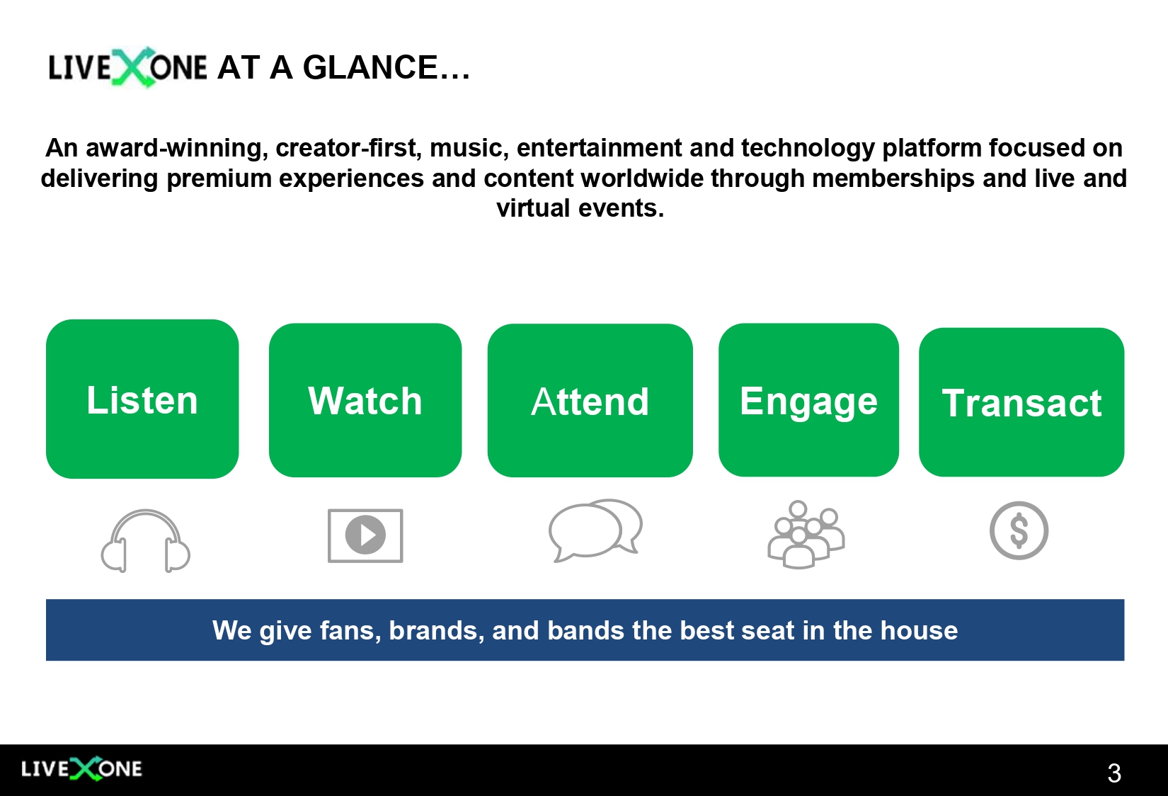 An award - winning, creator - first, music, entertainment and technology platform focused on delivering premium experiences and content worldwide through memberships and live and virtual events. We give fans, brands, and bands the best seat in the house Listen Watch A ttend Engage Transact AT A GLANCE… 3