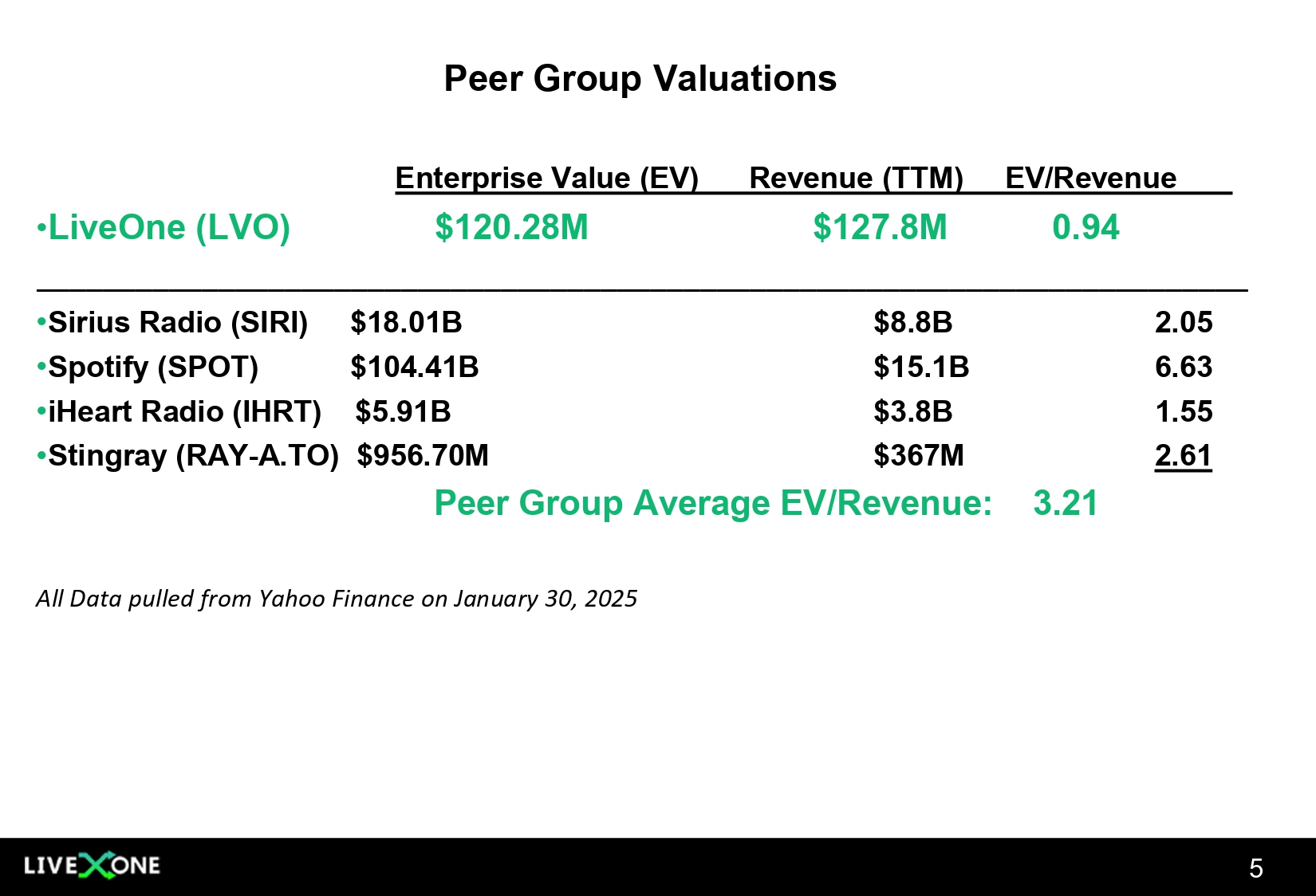 Peer Group Valuations 5 EV/Revenue Revenue (TTM) Enterprise Value (EV) 0.94 $127.8M $120.28M • LiveOne (LVO) 2.05 $8.8B $18.01B • Sirius Radio (SIRI) 6.63 $15.1B $104.41B • Spotify (SPOT) 1.55 $3.8B $5.91B • iHeart Radio (IHRT) 2.61 $367M $956.70M • Stingray (RAY - A.TO) Peer Group Average EV/Revenue: 3.21 All Data pulled from Yahoo Finance on January 30, 2025