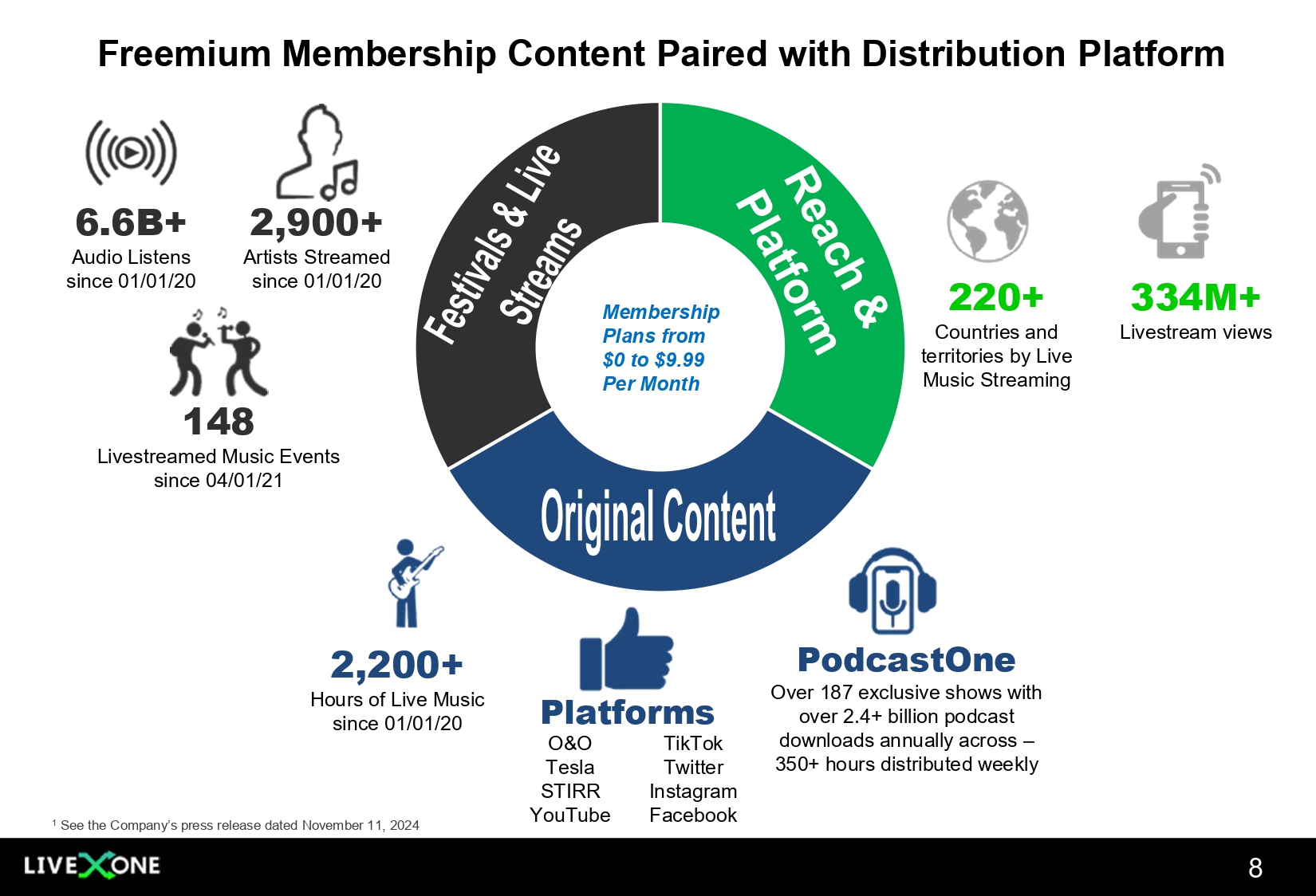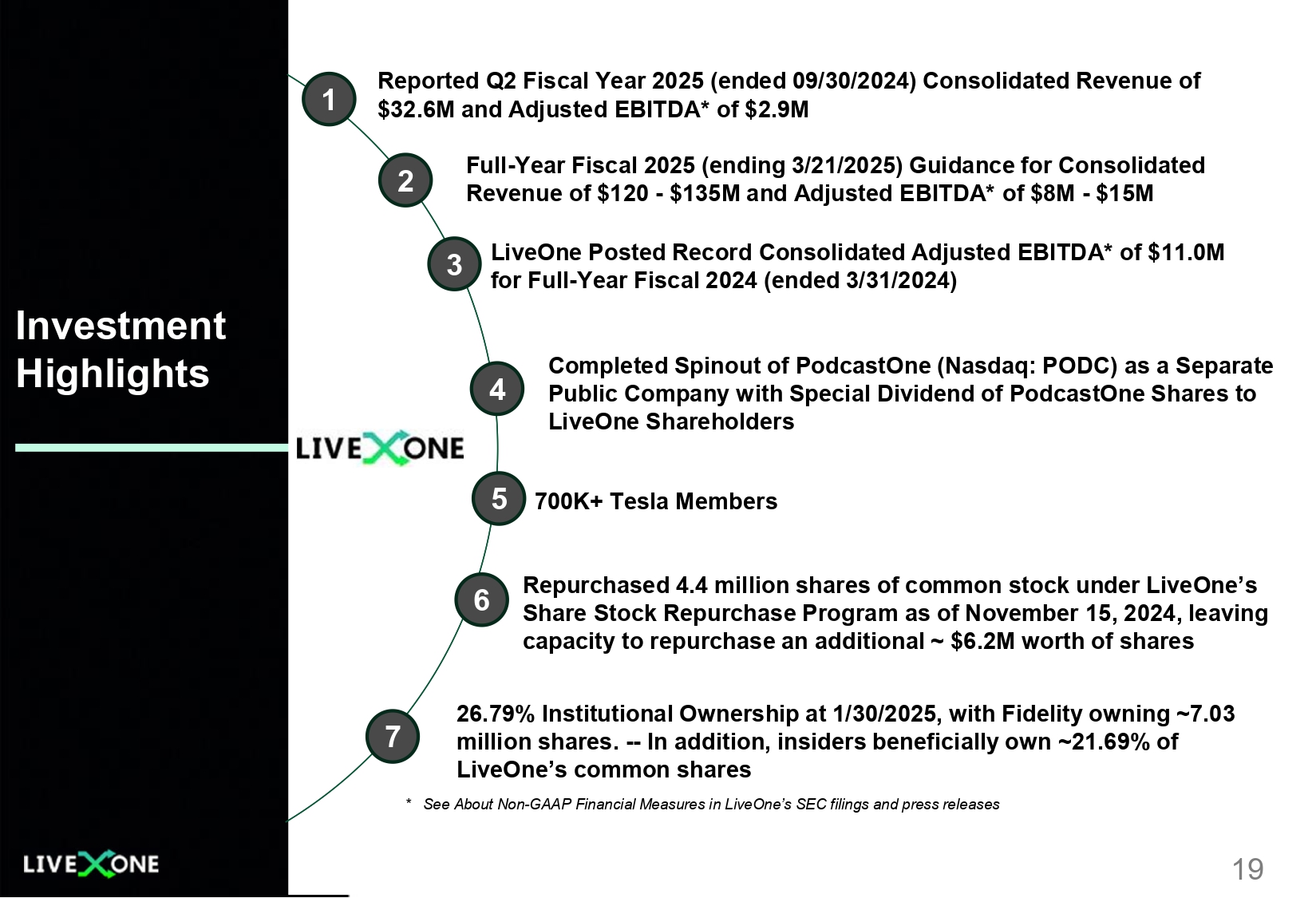 Investment Highlights 700K+ Tesla Members 3 5 6 Reported Q2 Fiscal Year 2025 (ended 09/30/2024) Consolidated Revenue of $32.6M and Adjusted EBITDA* of $2.9M 1 2 7 Repurchased 4.4 million shares of common stock under LiveOne’s Share Stock Repurchase Program as of November 15, 2024, leaving capacity to repurchase an additional ~ $6.2M worth of shares 4 19 Full - Year Fiscal 2025 (ending 3/21/2025) Guidance for Consolidated Revenue of $120 - $135M and Adjusted EBITDA* of $8M - $15M LiveOne Posted Record Consolidated Adjusted EBITDA* of $11.0M for Full - Year Fiscal 2024 (ended 3/31/2024) 26.79% Institutional Ownership at 1/30/2025, with Fidelity owning ~7.03 million shares. -- In addition, insiders beneficially own ~21.69% of LiveOne’s common shares * See About Non - GAAP Financial Measures in LiveOne’s SEC filings and press releases Completed Spinout of PodcastOne (Nasdaq: PODC) as a Separate Public Company with Special Dividend of PodcastOne Shares to LiveOne Shareholders