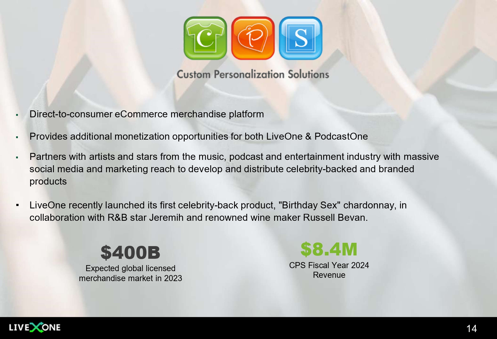 PPVOne Business Model 126+ PPV EVENTS* 217K + TICKETS SOLD* PPV EVENTS TO DATE REVENUE SOURCES • PPV Ticket Sales with Revenue Share • Sponsorship and Advertising/Product Placement • VIP Exclusive Upgrade Options • Digital Meet and Greet Opportunities • NFTs and E - Commerce • Artist Merchandise Sales • In - App Purchases 13 • PPVOne’s Business Model Leverages LiveOne’s existing proprietary tech stack and expertise with more than seven years of livestreaming experience and scalable product. • Direct to consumer billing relationship enhances both PPVOne and LiveOne’s flywheels for increased monetization opportunities . Expands far beyond just PPV ticket transactions to include music subscriptions, virtual meet and greets/VIP access, merchandise and NFT e - commerce offerings and virtual tipping . • Leveraging’s LiveOne’s marketing engine with in - app messaging, social media, paid marketing program, email blasts to our fan database of 38M+ music fans; promoted across our LiveOne platform and partner network. • Leveraging relationships with thousands of possible PPV entertainers and personalities through ongoing business activities of LiveOne. • Strong connection between PPV participants and social followers enables for a stronger business model through lower marketing spend as artists and talent actively promote PPV events directly to their social media resulting in lower customer acquisition costs. • PPVOne’s execution capabilities are turnkey ranging from artist/talent signings, event marketing, sponsorship/advertising monetization, event production, digital and linear distribution through to settlement. *Since inception
