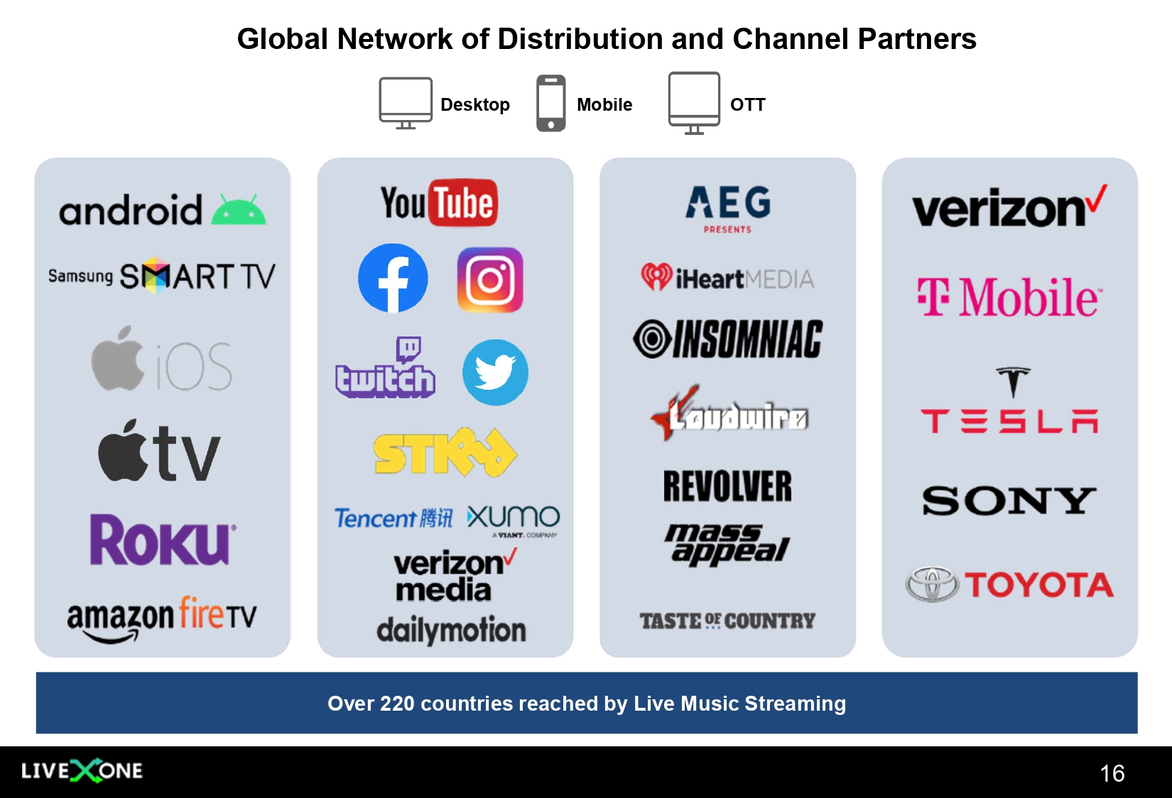 Global Network of Distribution and Channel Partners Desktop Mobile OTT Over 220 countries reached by Live Music Streaming 16