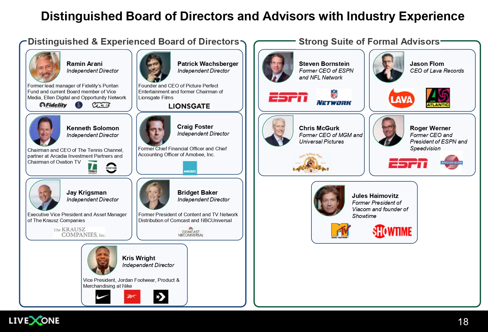 Ramin Arani Independent Director Former lead manager of Fidelity’s Puritan Fund and current Board member of Vice Media, Ellen Digital and Opportunity Network Patrick Wachsberger Independent Director Founder and CEO of Picture Perfect Entertainment and former Chairman of Lionsgate Films Steven Bornstein Former CEO of ESPN and NFL Network Jason Flom CEO of Lava Records Distinguished & Experienced Board of Directors Strong Suite of Formal Advisors Kenneth Solomon Independent Director Chairman and CEO of The Tennis Channel, partner at Arcadia Investment Partners and Chairman of Ovation TV Craig Foster Independent Director Former Chief Financial Officer and Chief Accounting Officer of Amobee, Inc. Chris McGurk Former CEO of MGM and Universal Pictures Roger Werner Former CEO and President of ESPN and Speedvision Jay Krigsman Independent Director Executive Vice President and Asset Manager of The Krausz Companies Bridget Baker Independent Director Former President of Content and TV Network Distribution of Comcast and NBCUniversal Jules Haimovitz Former President of Viacom and founder of Showtime Distinguished Board of Directors and Advisors with Industry Experience Kris Wright Independent Director Vice President, Jordan Footwear, Product & Merchandising at Nike 18