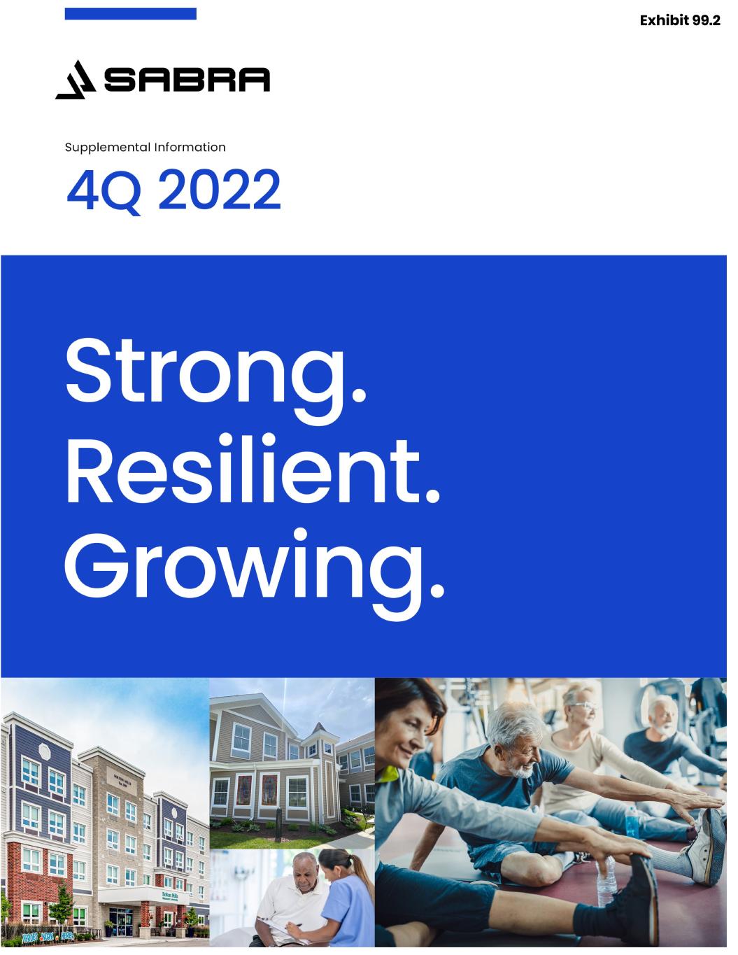 27 SABRA 4Q 2022 SUPPLEMENTAL INFORMATION December 31, 2022 APPENDIX Disclaimer Disclaimer This supplement contains “forward-looking” information as that term is defined in the Private Securities Litigation Reform Act of 1995. Any statements that do not relate to historical or current facts or matters are forward-looking statements. Examples of forward-looking statements include all statements regarding our expected future financial position, results of operations, cash flows, liquidity, business strategy, growth opportunities, potential investments, and plans and objectives for future operations. You can identify some of the forward-looking statements by the use of forward-looking words such as "anticipate," "believe," "plan," "estimate," "expect," "intend," "should," "may" and other similar expressions, although not all forward-looking statements contain these identifying words. Our actual results may differ materially from those projected or contemplated by our forward-looking statements as a result of various factors, including, among others, the following: pandemics or epidemics, including COVID-19, and the related impact on our tenants, borrowers and Senior Housing - Managed communities; increased labor costs and historically low unemployment; increases in market interest rates and inflation; operational risks with respect to our Senior Housing - Managed communities; competitive conditions in our industry; the loss of key management personnel; uninsured or underinsured losses affecting our properties; potential impairment charges and adjustments related to the accounting of our assets; the potential variability of our reported rental and related revenues as a result of Accounting Standards Update (“ASU”) 2016-02, Leases, as amended by subsequent ASUs; risks associated with our investment in our unconsolidated joint ventures; catastrophic weather and other natural or man-made disasters, the effects of climate change on our properties and a failure to implement sustainable and energy-efficient measures; increased operating costs and competition for our tenants, borrowers and Senior Housing - Managed communities; increased healthcare regulation and enforcement; our tenants’ dependency on reimbursement from governmental and other third-party payor programs; the effect of our tenants, operators or borrowers declaring bankruptcy or becoming insolvent; our ability to find replacement tenants and the impact of unforeseen costs in acquiring new properties; the impact of litigation and rising insurance costs on the business of our tenants; the impact of required regulatory approvals of transfers of healthcare properties; environmental compliance costs and liabilities associated with real estate properties we own; our tenants’, borrowers' or operators’ failure to adhere to applicable privacy and data security laws, or a material breach of our or our tenants’, borrowers' or operators’ information technology; our concentration in the healthcare property sector, particularly in skilled nursing/transitional care facilities and senior housing communities, which makes our profitability more vulnerable to a downturn in a specific sector than if we were investing in multiple industries; the significant amount of and our ability to service our indebtedness; covenants in our debt agreements that may restrict our ability to pay dividends, make investments, incur additional indebtedness and refinance indebtedness on favorable terms; adverse changes in our credit ratings; our ability to make dividend distributions at expected levels; our ability to raise capital through equity and debt financings; changes and uncertainty in macroeconomic conditions and disruptions in the financial markets; risks associated with our ownership of property outside the U.S., including currency fluctuations; the relatively illiquid nature of real estate investments; our ability to maintain our status as a real estate investment trust (“REIT”) under the federal tax laws; compliance with REIT requirements and certain tax and tax regulatory matters related to our status as a REIT; changes in tax laws and regulations affecting REITs; the ownership limits and takeover defenses in our governing documents and under Maryland law, which may restrict change of control or business combination opportunities; and the exclusive forum provisions in our bylaws. Additional information concerning risks and uncertainties that could affect our business can be found in our filings with the Securities and Exchange Commission (the “SEC”), including in Part I, Item 1A of our Annual Report on Form 10-K for the year ended December 31, 2022. We do not intend, and we undertake no obligation, to update any forward-looking information to reflect events or circumstances after the date of this supplement or to reflect the occurrence of unanticipated events, unless required by law to do so. Note Regarding Non-GAAP Financial Measures This supplement includes the following financial measures defined as non-GAAP financial measures by the SEC: net operating income (“NOI”), Cash NOI, funds from operations (“FFO”), Normalized FFO, Adjusted FFO (“AFFO”), Normalized AFFO, FFO per diluted common share, Normalized FFO per diluted common share, AFFO per diluted common share, Normalized AFFO per diluted common share and Adjusted EBITDA (defined below). These measures may be different than non-GAAP financial measures used by other companies, and the presentation of these measures is not intended to be considered in isolation or as a substitute for financial information prepared and presented in accordance with U.S. generally accepted accounting principles. An explanation of these non-GAAP financial measures is included under “Reporting Definitions” in this supplement and reconciliations of these non-GAAP financial measures to the GAAP financial measures we consider most comparable are included on the Investors section of our websi