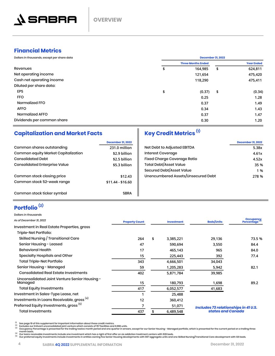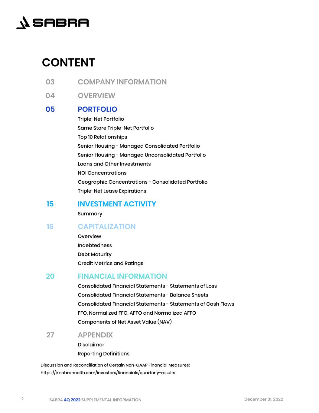 2 SABRA 4Q 2022 SUPPLEMENTAL INFORMATION December 31, 2022 03 COMPANY INFORMATION 04 OVERVIEW 05 PORTFOLIO Triple-Net Portfolio Same Store Triple-Net Portfolio Top 10 Relationships Senior Housing - Managed Consolidated Portfolio Senior Housing - Managed Unconsolidated Portfolio Loans and Other Investments NOI Concentrations Geographic Concentrations - Consolidated Portfolio Triple-Net Lease Expirations 15 INVESTMENT ACTIVITY Summary 16 CAPITALIZATION Overview Indebtedness Debt Maturity Credit Metrics and Ratings 20 FINANCIAL INFORMATION Consolidated Financial Statements - Statements of Loss Consolidated Financial Statements - Balance Sheets Consolidated Financial Statements - Statements of Cash Flows FFO, Normalized FFO, AFFO and Normalized AFFO Components of Net Asset Value (NAV) 27 APPENDIX Disclaimer Reporting Definitions Discussion and Reconciliation of Certain Non-GAAP Financial Measures: CONTENT https://ir.sabrahealth.com/investors/financials/quarterly-results