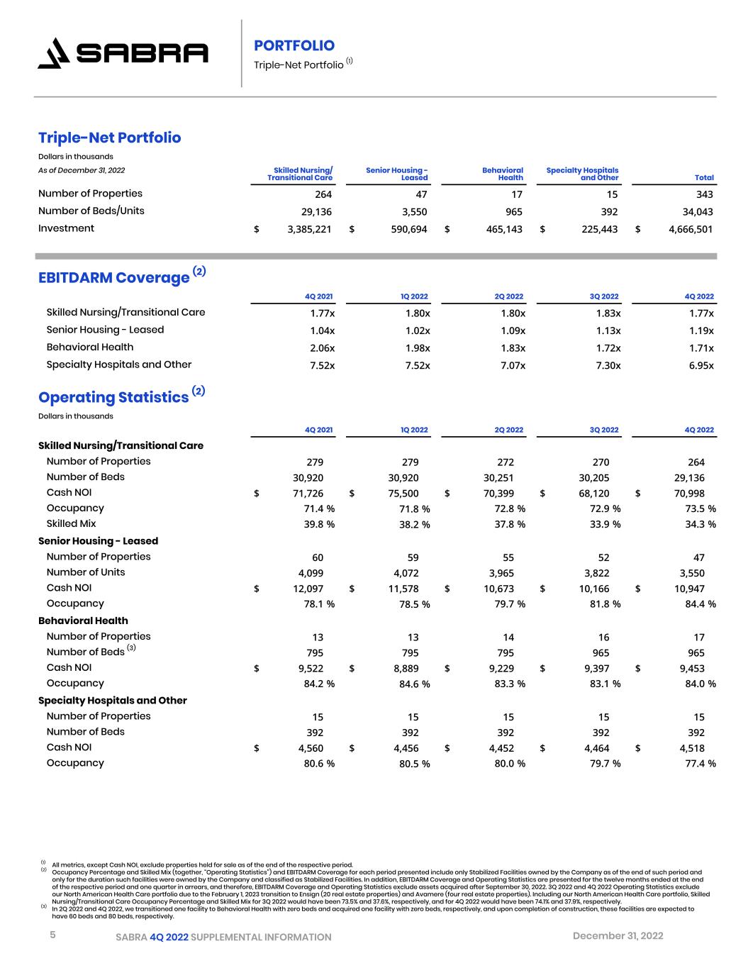 4 SABRA 4Q 2022 SUPPLEMENTAL INFORMATION December 31, 2022 Financial Metrics Dollars in thousands, except per share data December 31, 2022 Three Months Ended Year Ended Revenues $ 164,985 $ 624,811 Net operating income 121,654 475,420 Cash net operating income 118,290 475,411 Diluted per share data: EPS $ (0.37) $ (0.34) FFO 0.25 1.28 Normalized FFO 0.37 1.49 AFFO 0.34 1.43 Normalized AFFO 0.37 1.47 Dividends per common share 0.30 1.20 Capitalization and Market Facts Key Credit Metrics (1) December 31, 2022 December 31, 2022 Common shares outstanding 231.0 million Net Debt to Adjusted EBITDA 5.38x Common equity Market Capitalization $2.9 billion Interest Coverage 4.61x Consolidated Debt $2.5 billion Fixed Charge Coverage Ratio 4.52x Consolidated Enterprise Value $5.3 billion Total Debt/Asset Value 35 % Secured Debt/Asset Value 1 % Common stock closing price $12.43 Unencumbered Assets/Unsecured Debt 278 % Common stock 52-week range $11.44 - $16.60 Common stock ticker symbol SBRA Portfolio (2) Dollars in thousands As of December 31, 2022 Property Count Investment Beds/Units Occupancy Percentage (3) Investment in Real Estate Properties, gross Triple-Net Portfolio: Skilled Nursing / Transitional Care 264 $ 3,385,221 29,136 73.5 % Senior Housing - Leased 47 590,694 3,550 84.4 Behavioral Health 17 465,143 965 84.0 Specialty Hospitals and Other 15 225,443 392 77.4 Total Triple-Net Portfolio 343 4,666,501 34,043 Senior Housing - Managed 59 1,205,283 5,942 82.1 Consolidated Real Estate Investments 402 5,871,784 39,985 Unconsolidated Joint Venture Senior Housing - Managed 15 180,793 1,698 89.2 Total Equity Investments 417 6,052,577 41,683 Investment in Sales-Type Lease, net 1 25,488 Investments in Loans Receivable, gross (4) 12 360,412 Preferred Equity Investments, gross (5) 7 51,071 Includes 73 relationships in 41 U.S. states and CanadaTotal Investments 437 $ 6,489,548 (1) See page 19 of this supplement for important information about these credit metrics. (2) Excludes our Enlivant unconsolidated joint venture which consists of 157 facilities and 6,996 units. (3) Occupancy Percentage is presented for the trailing twelve month period and one quarter in arrears, except for our Senior Housing - Managed portfolio, which is presented for the current period on a trailing three month basis. (4) Our loans receivable investments include one investment which has a right of first offer on six addiction treatment centers with 928 beds. (5) Our preferred equity investments include investments in entities owning five Senior Housing developments with 697 aggregate units and one Skilled Nursing/Transitional Care development with 120 beds. OVERVIEW